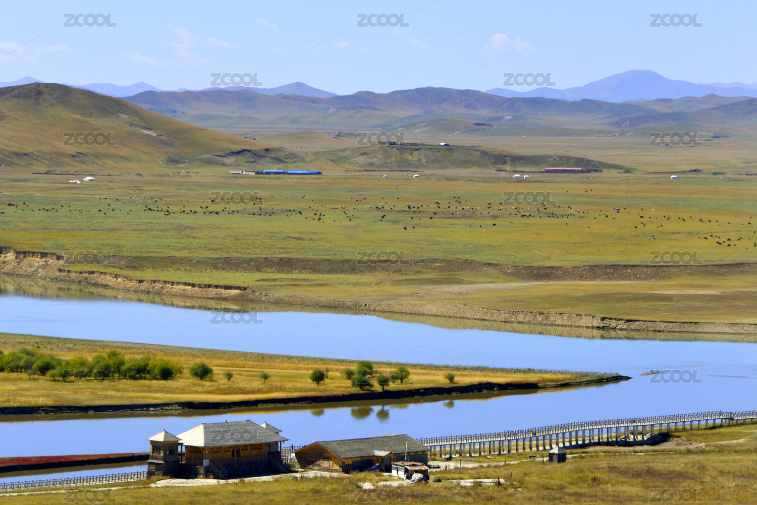 四川阿坝红原月亮湾的草原湿地和牦牛