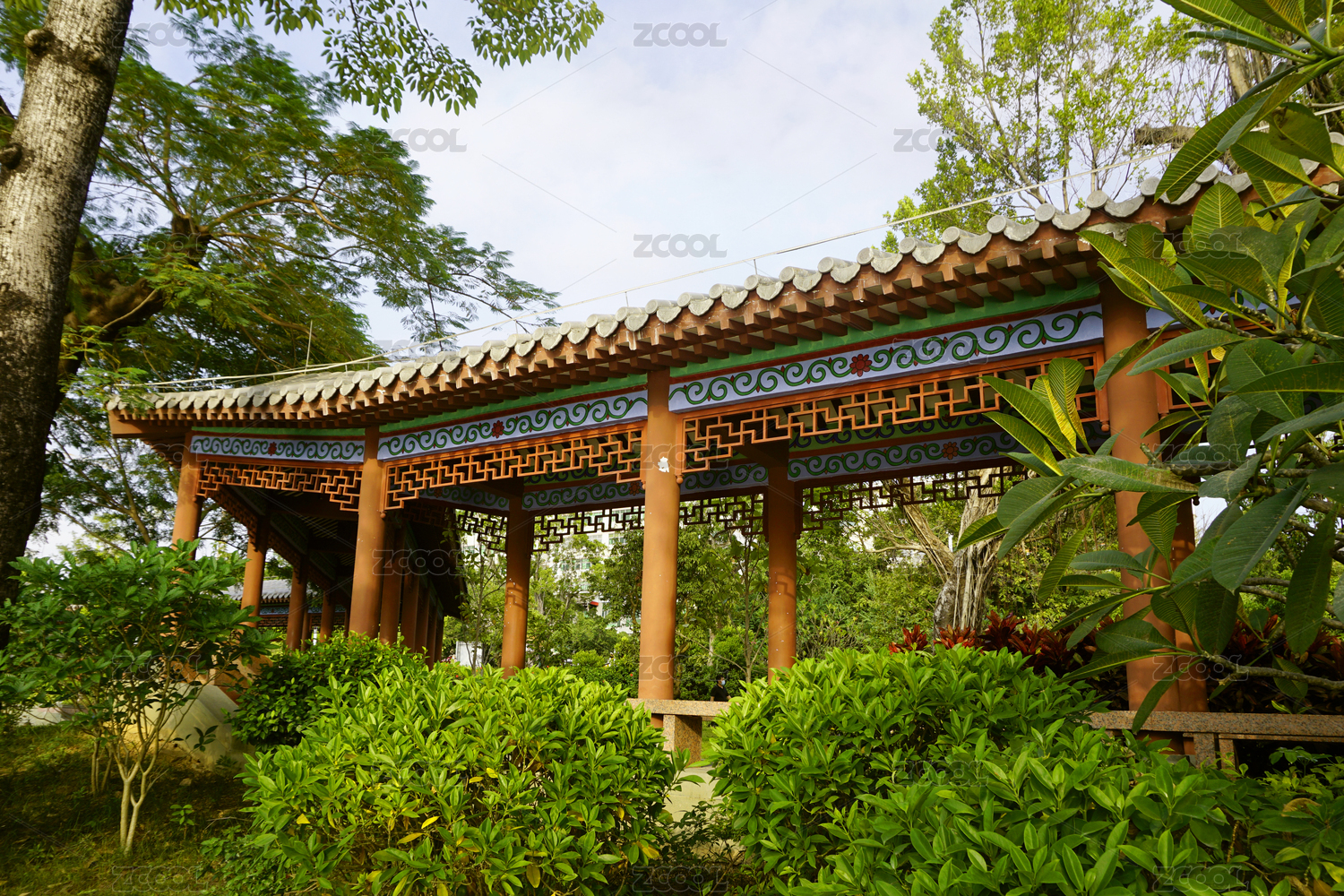 广东广州文化馆里的亭台楼阁与火红的凤凰花