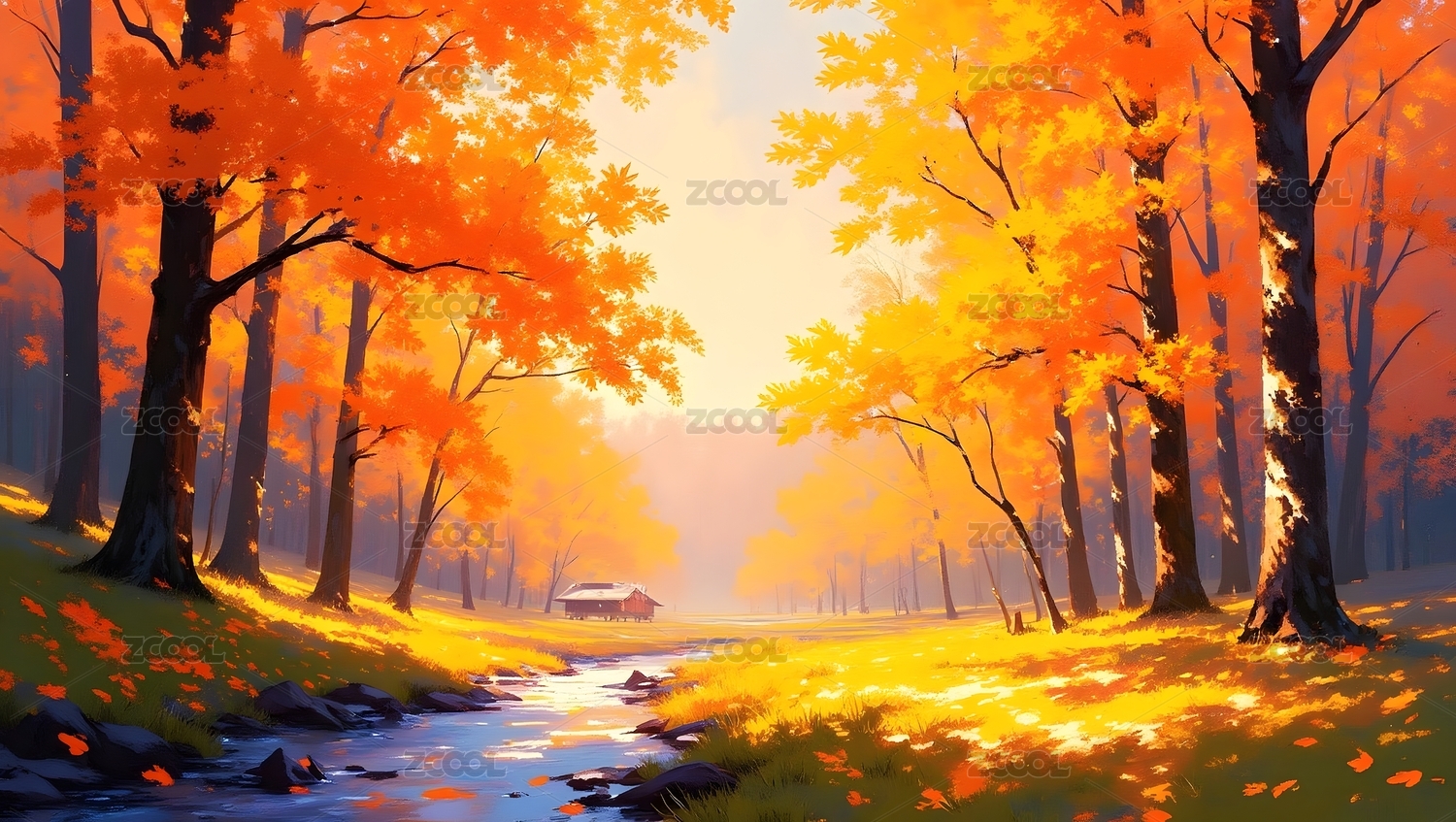 秋季,深秋,树林,溪水,大山,风景,插画,AIGC202402