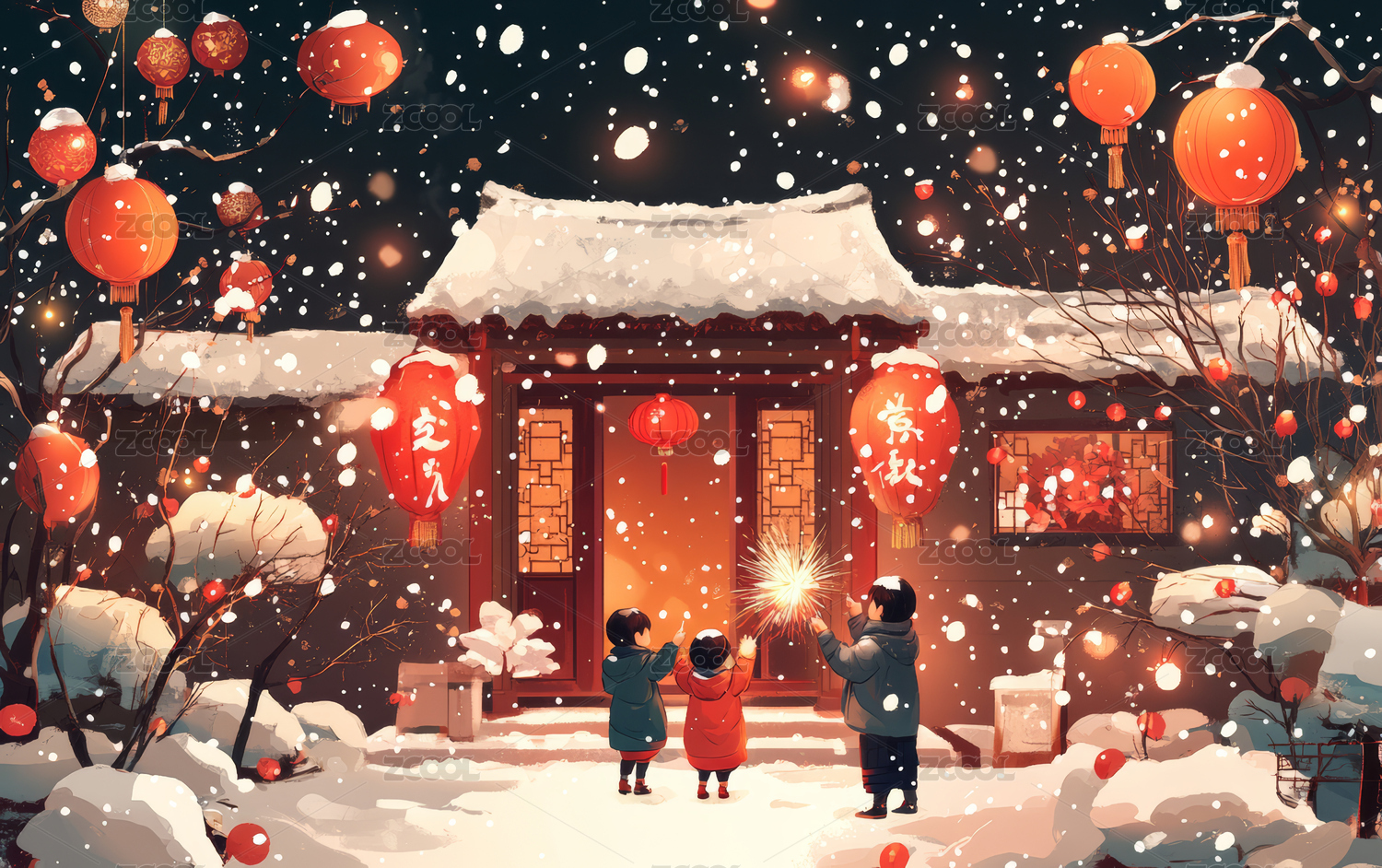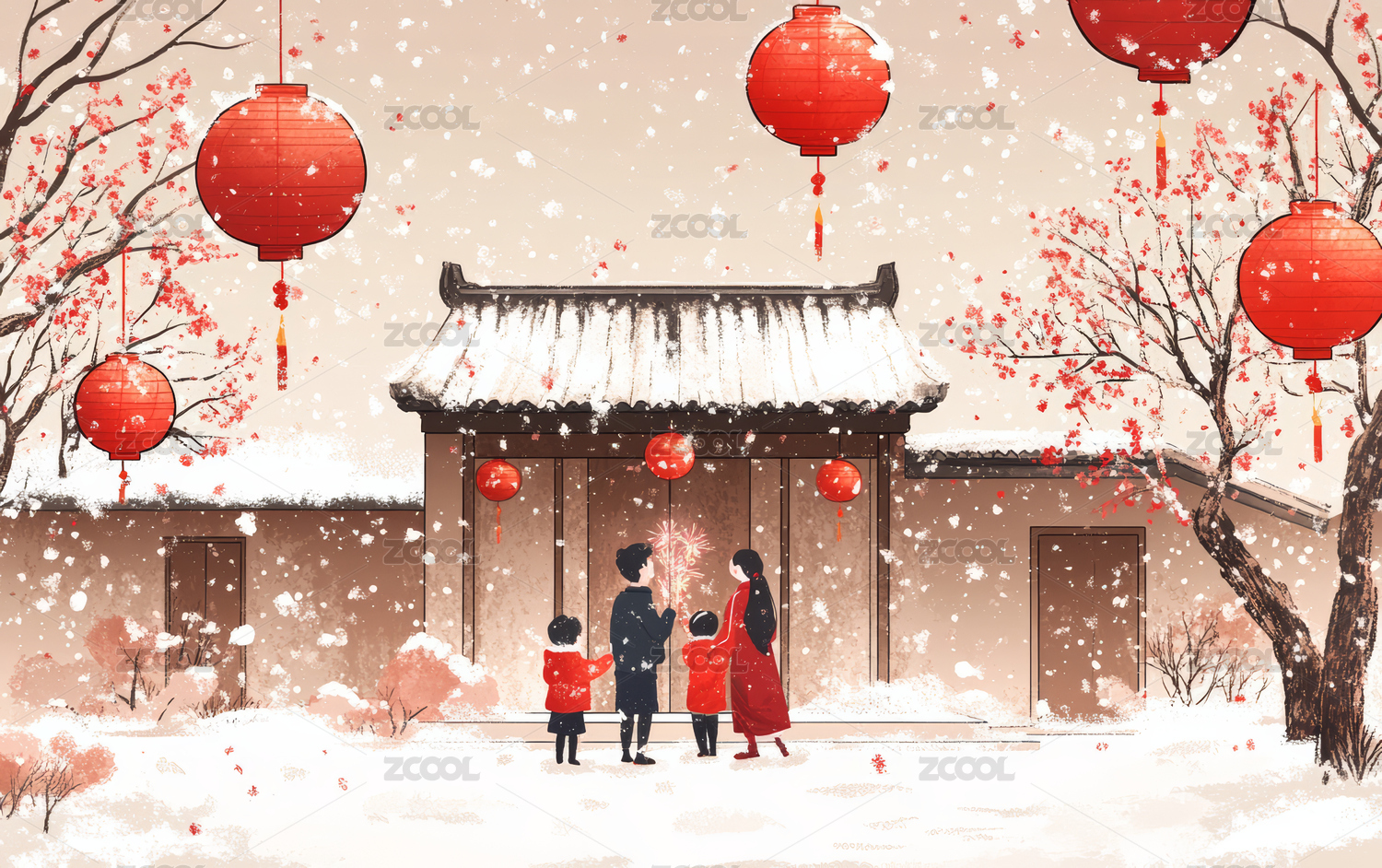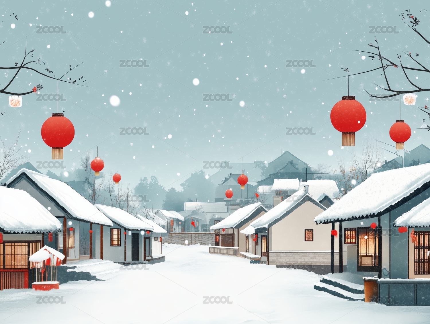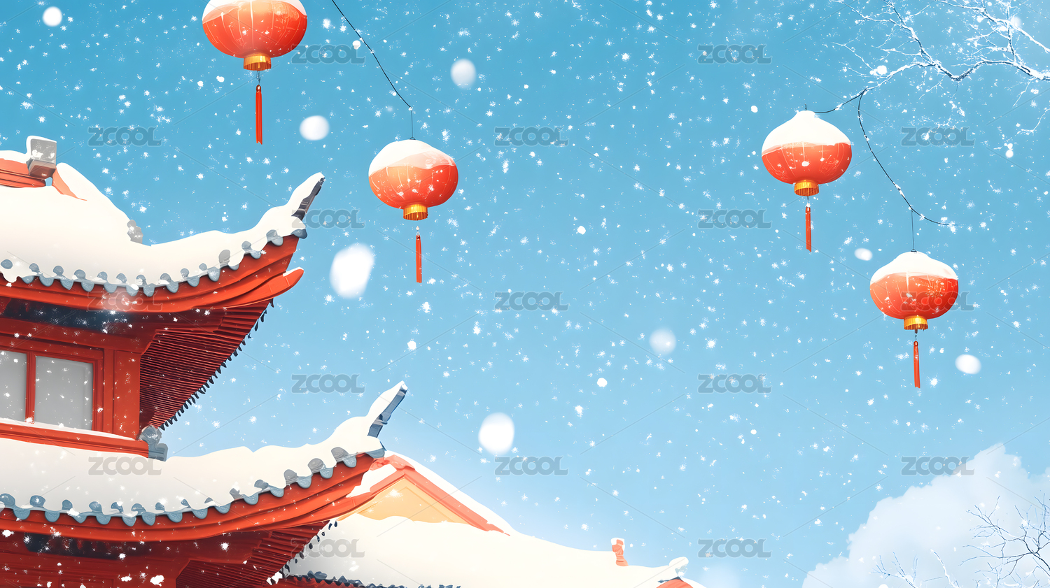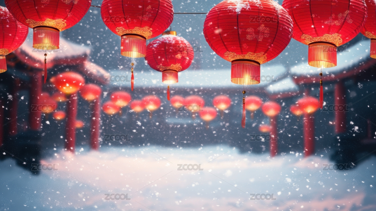 雪花飘飞红墙白瓦上红灯笼挂在梅花树枝上