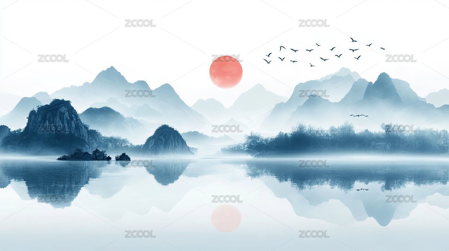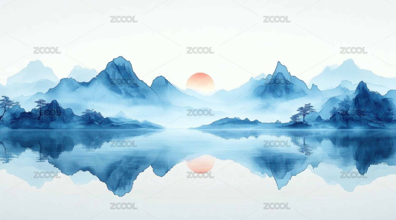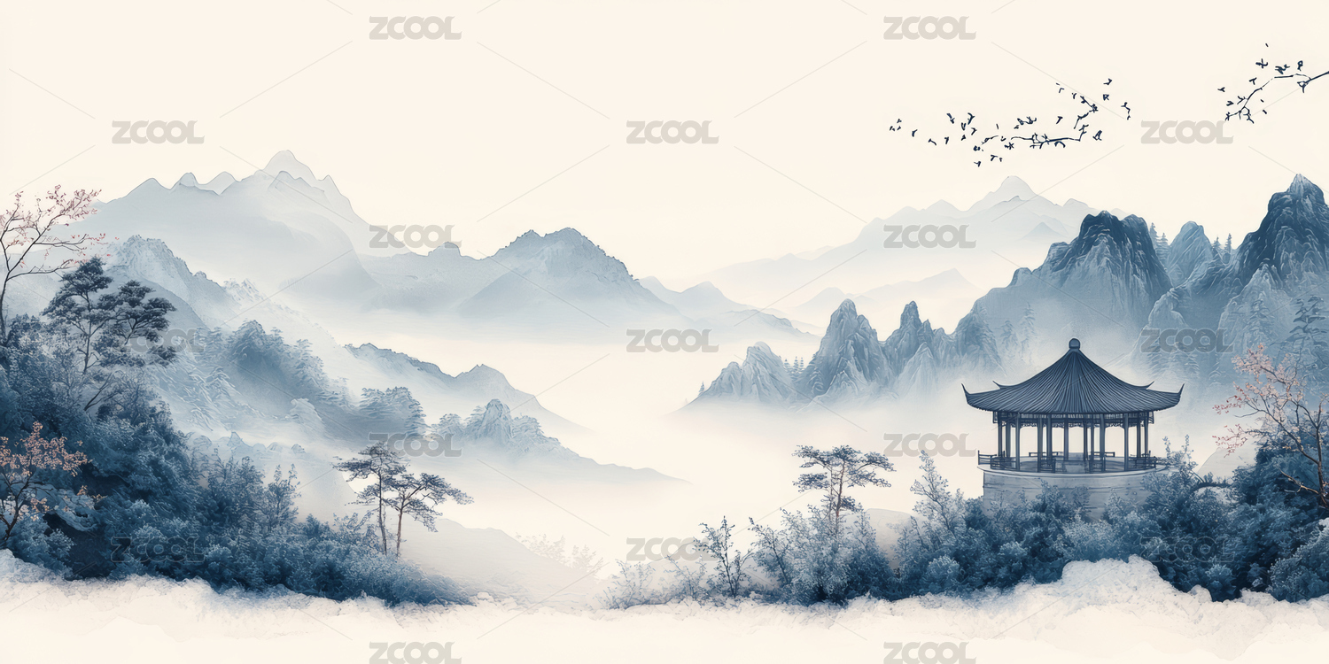 中国风,山水画,水墨画,意境,禅意,古韵,山峰,湖泊,亭台,树木