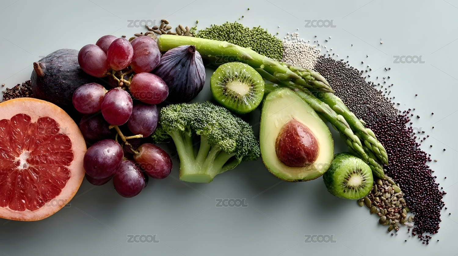白背景上一堆新鲜时令水果蔬菜和谷物豆类粮食