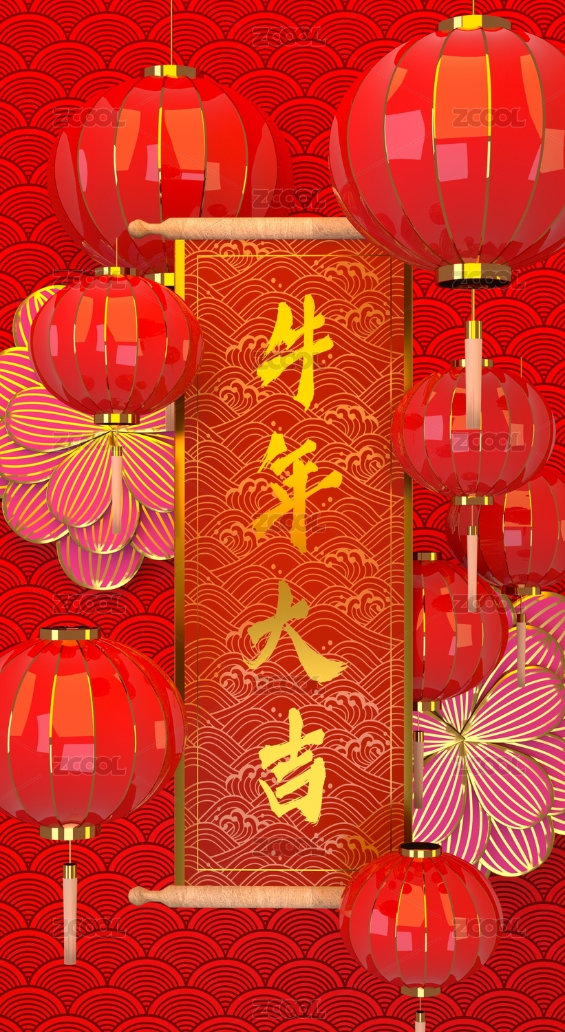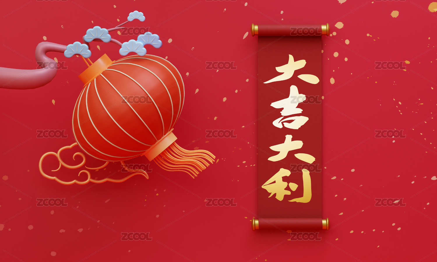 3D创意设计中国蛇年新春灯笼卷轴书法年会