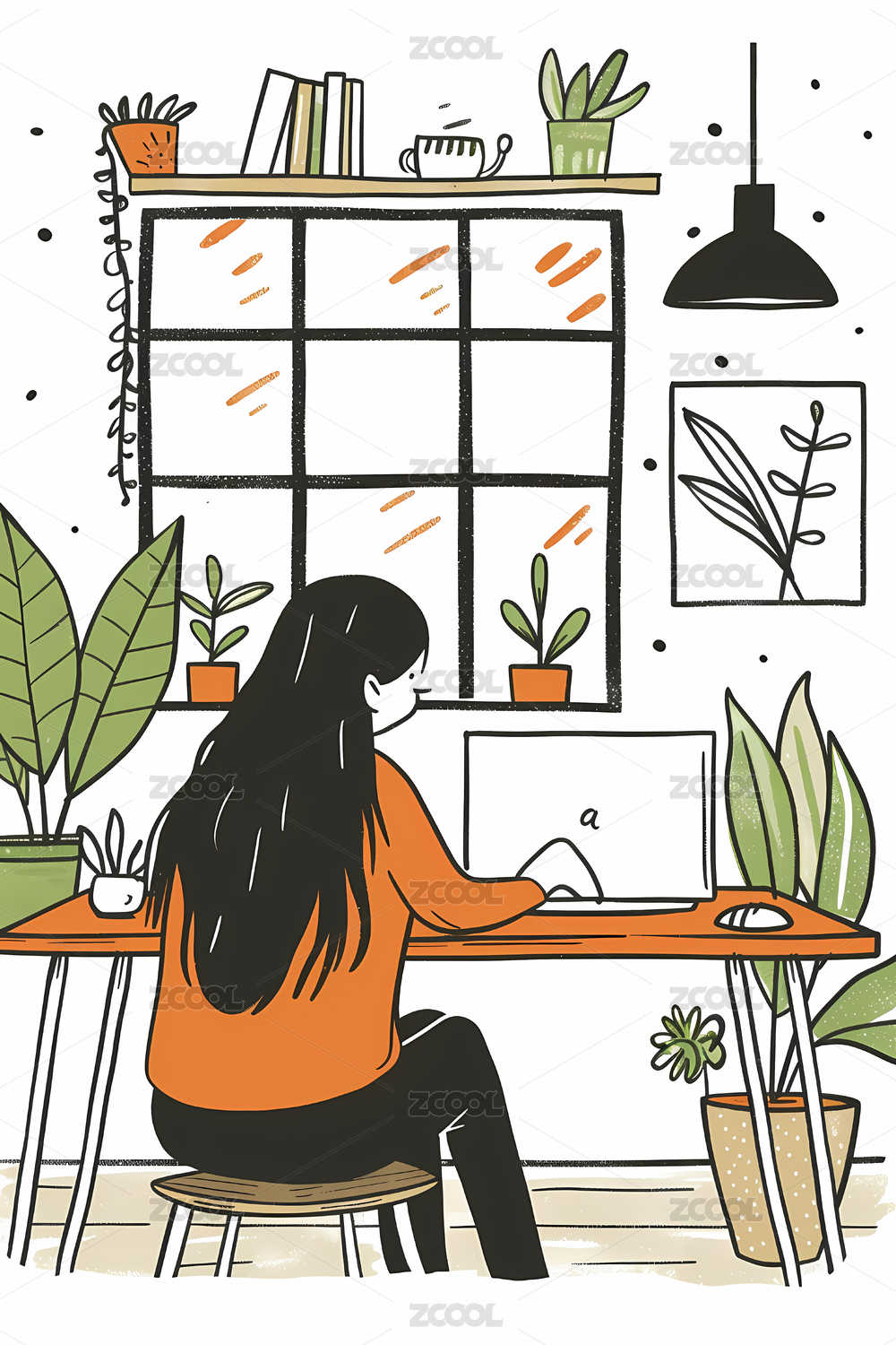 办公桌边 使用电脑办公聊天的加班的白领矢量海报插画背景坐在有飘窗的房间的办公桌前 使用电脑办公聊天的加班的白领矢量海报插画背景