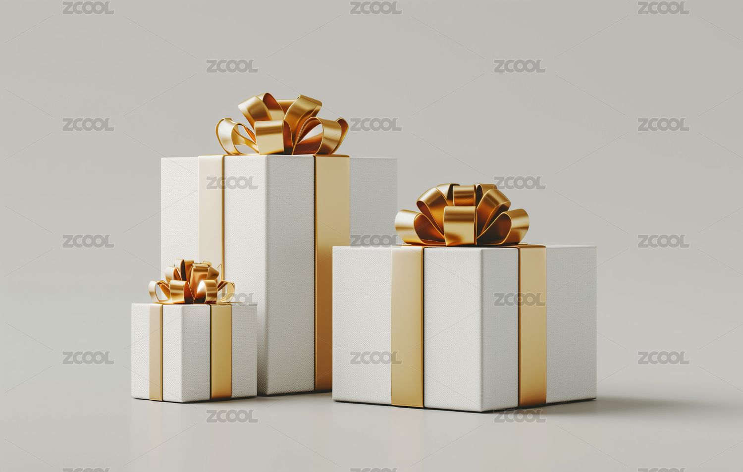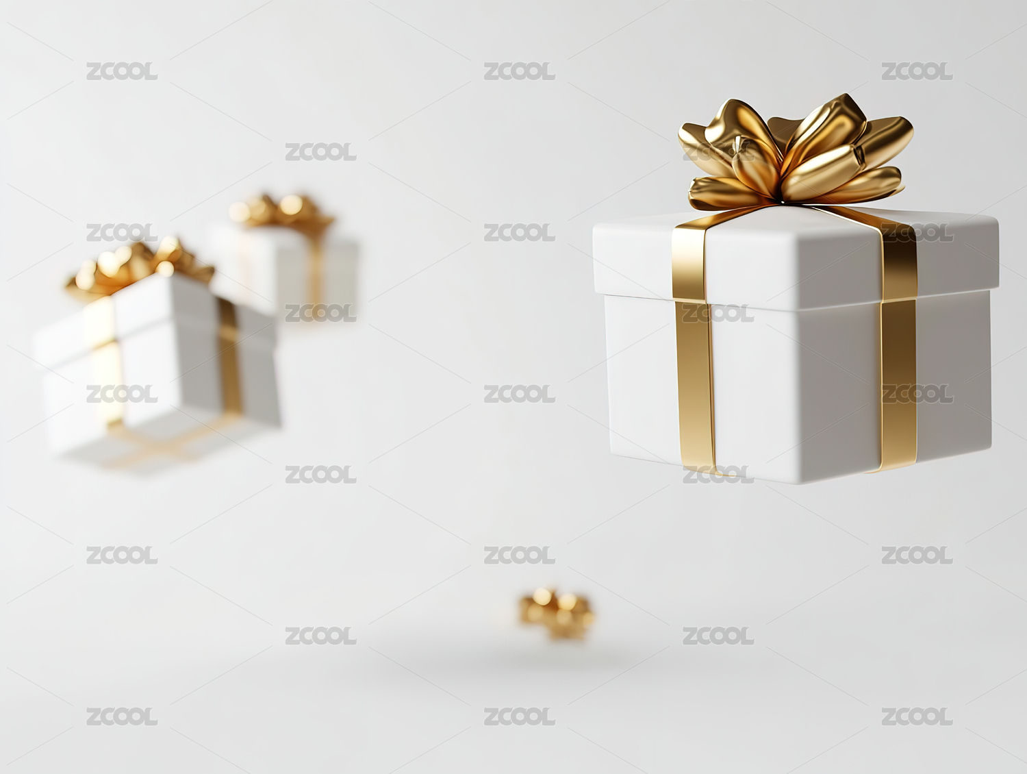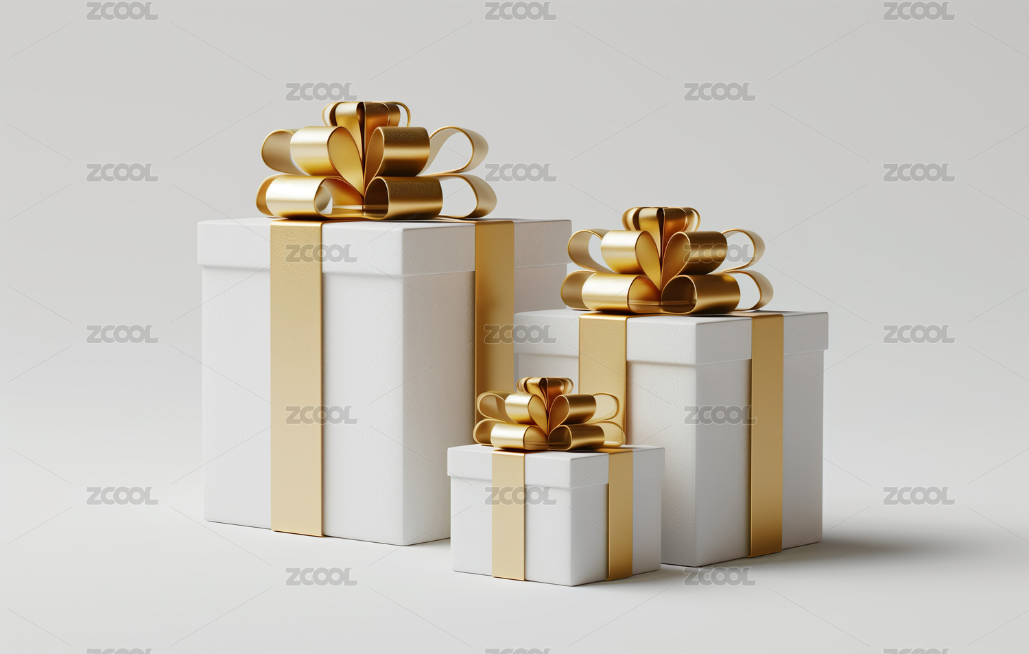 金色丝带的三个白色礼品盒漂浮浅在白色背景