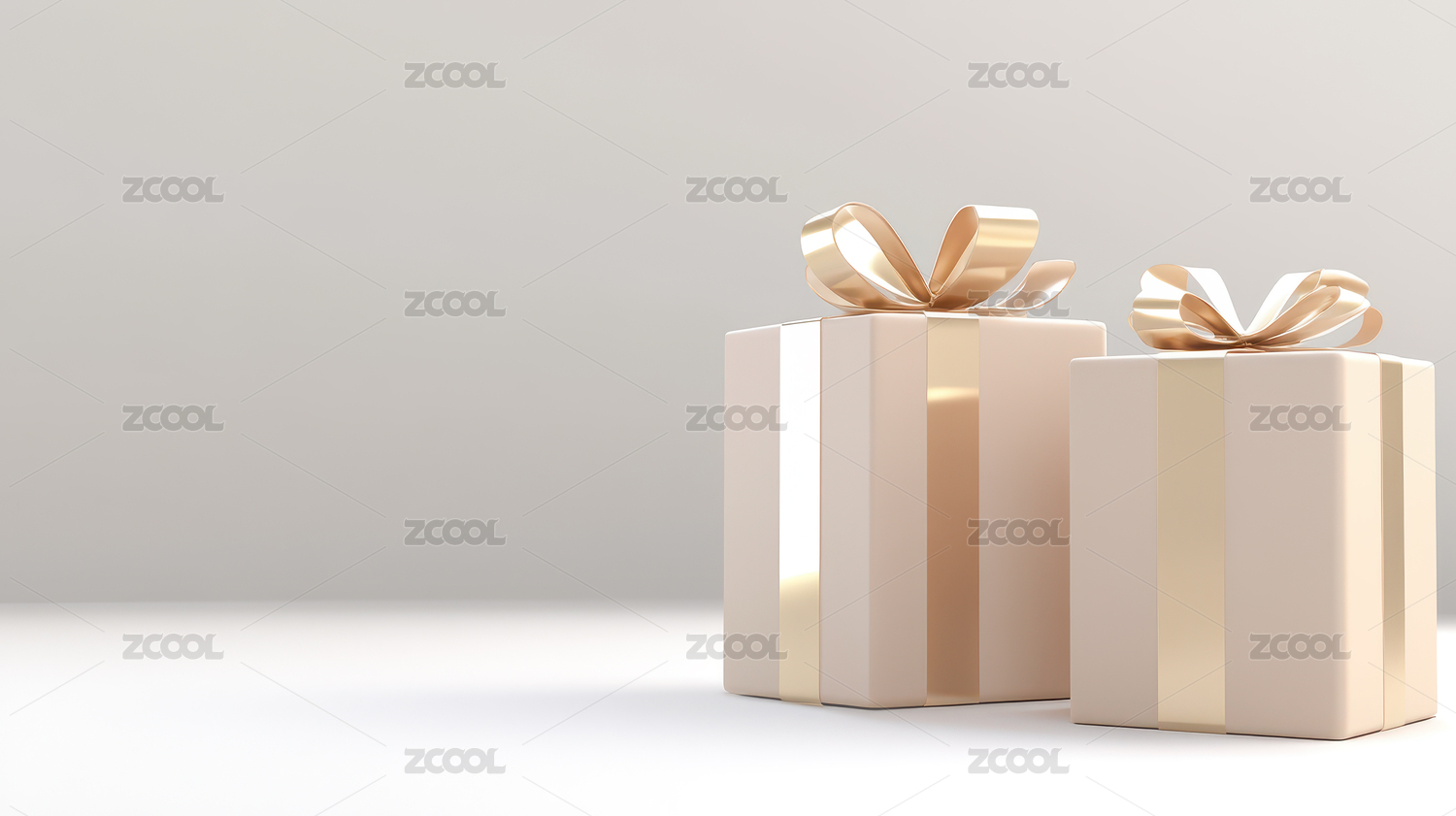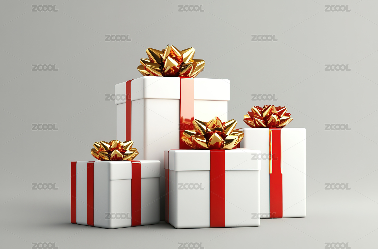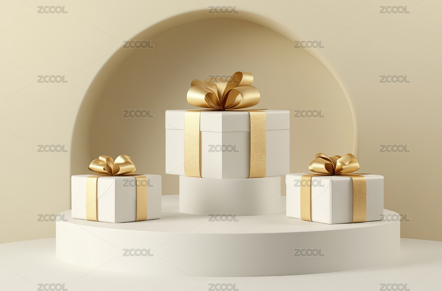 金色丝带的三个白色礼品盒漂浮浅在白色背景