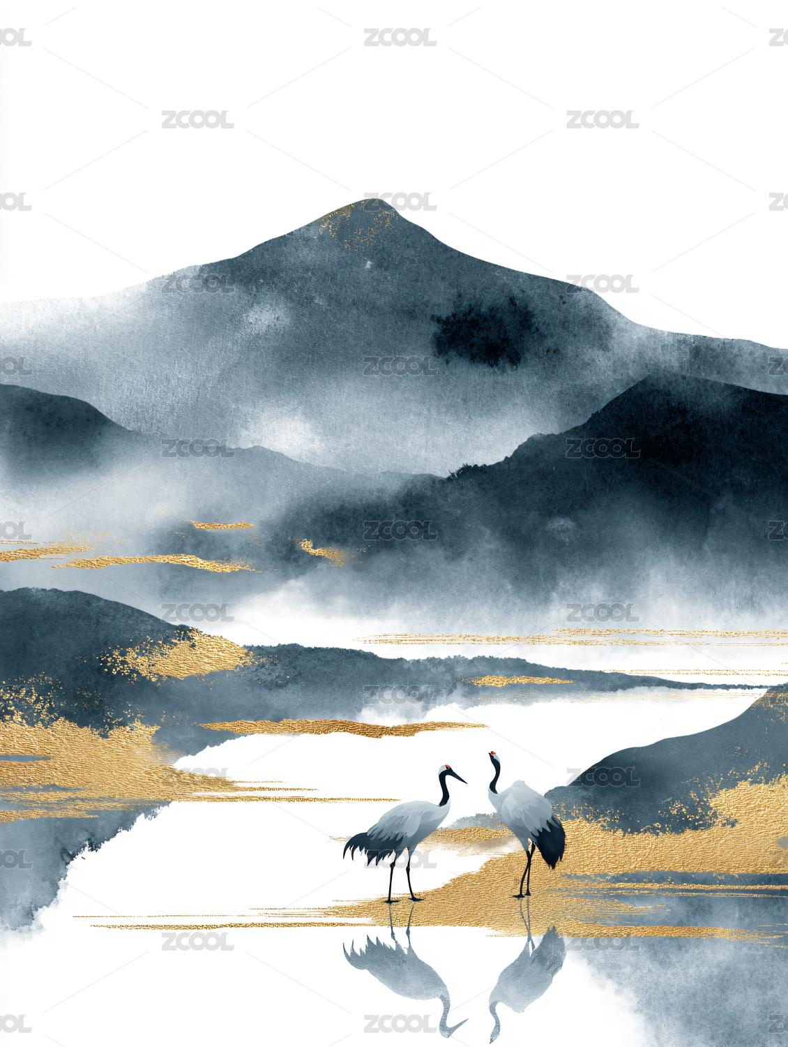 水墨山水日出日落太阳飞鸟瀑布寺庙