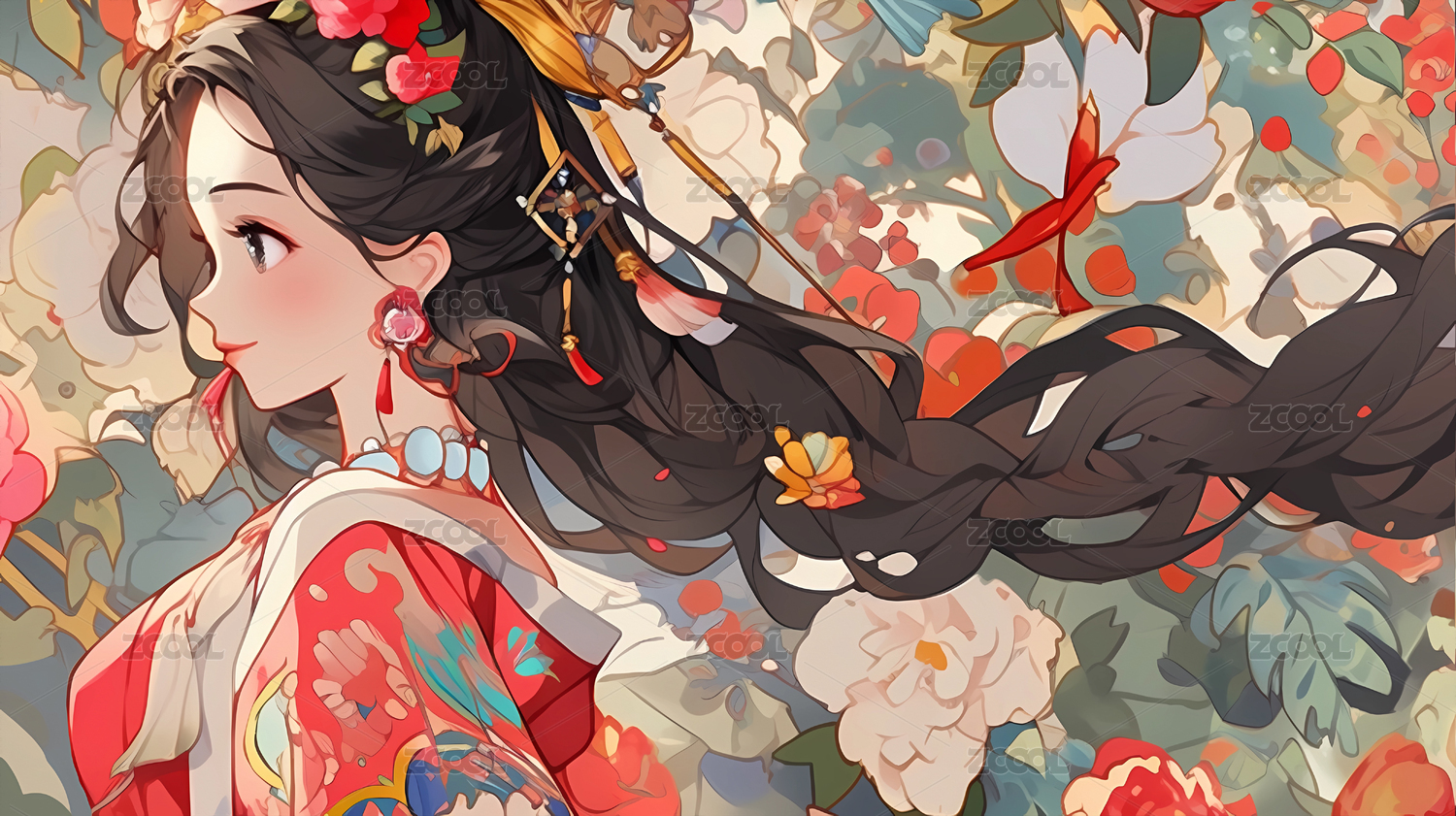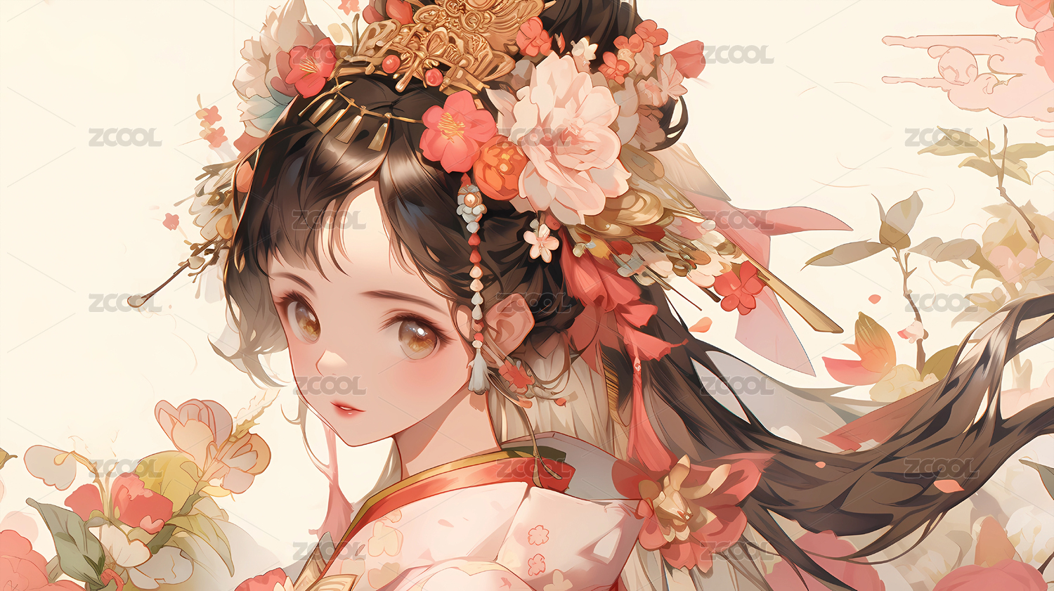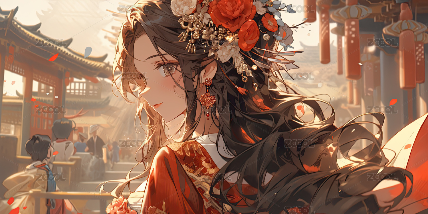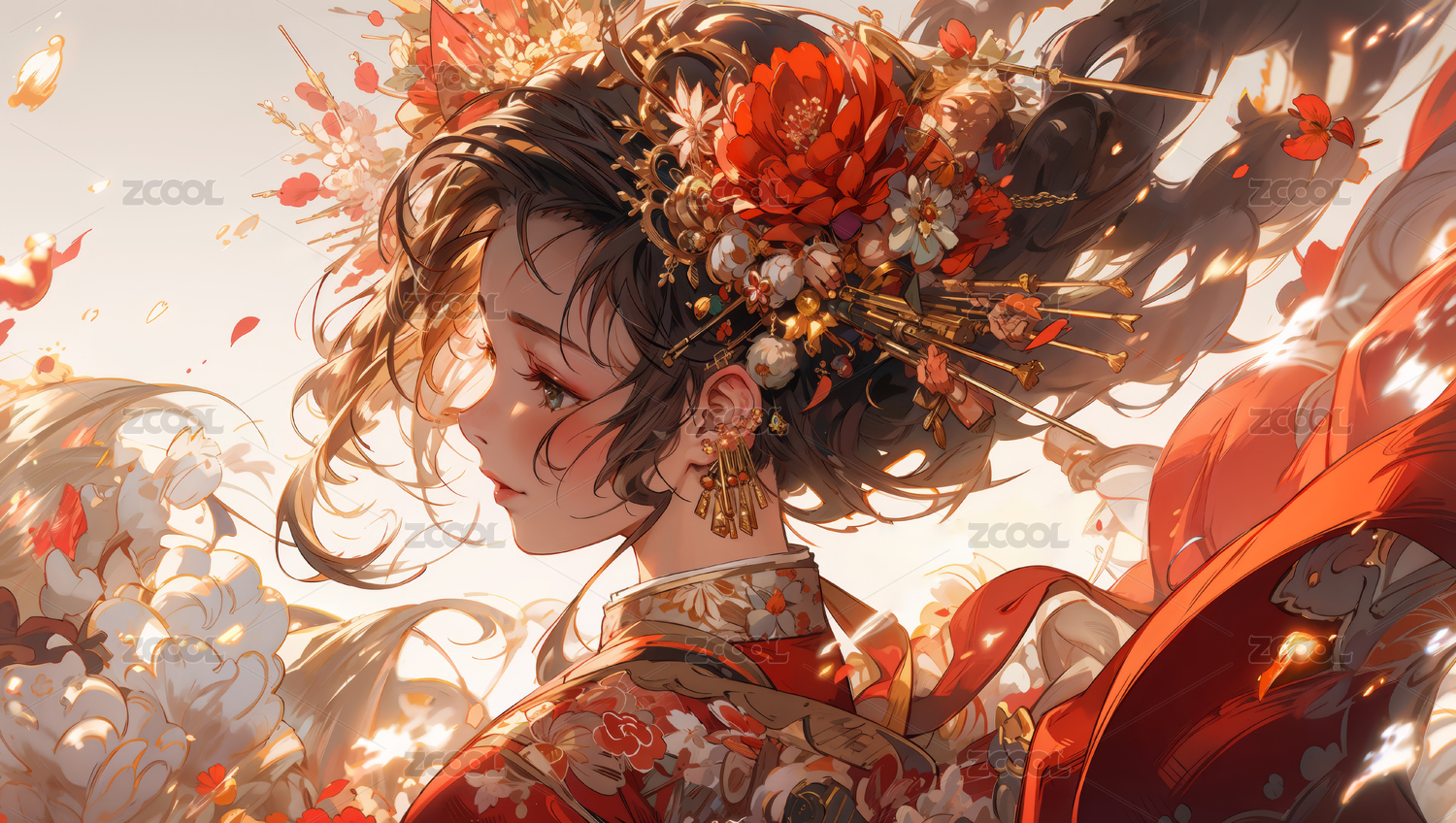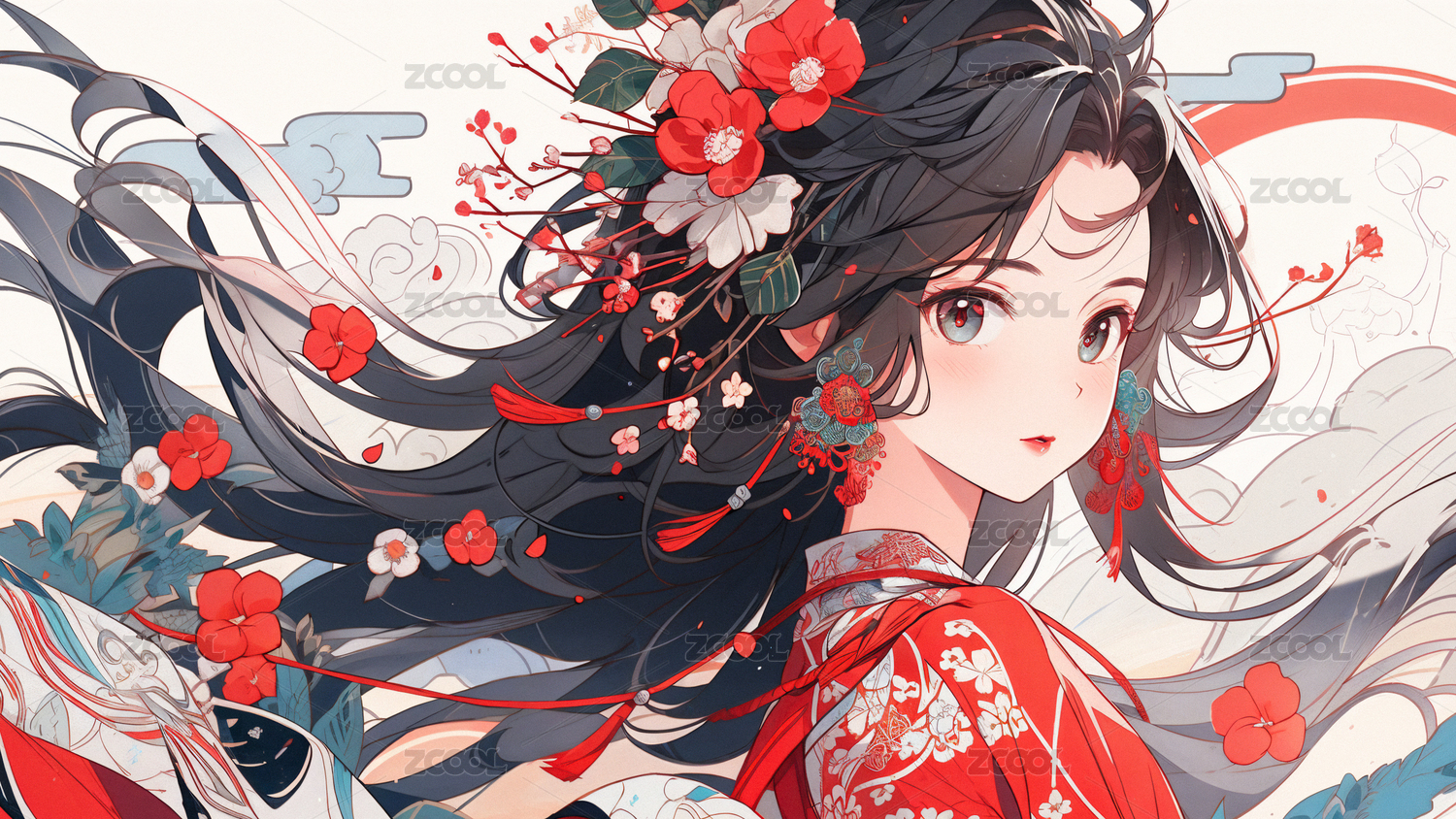 手绘,卡通,动漫,唯美,中国女孩,亚洲文化,女孩,亚洲女孩,盛装,吉祥