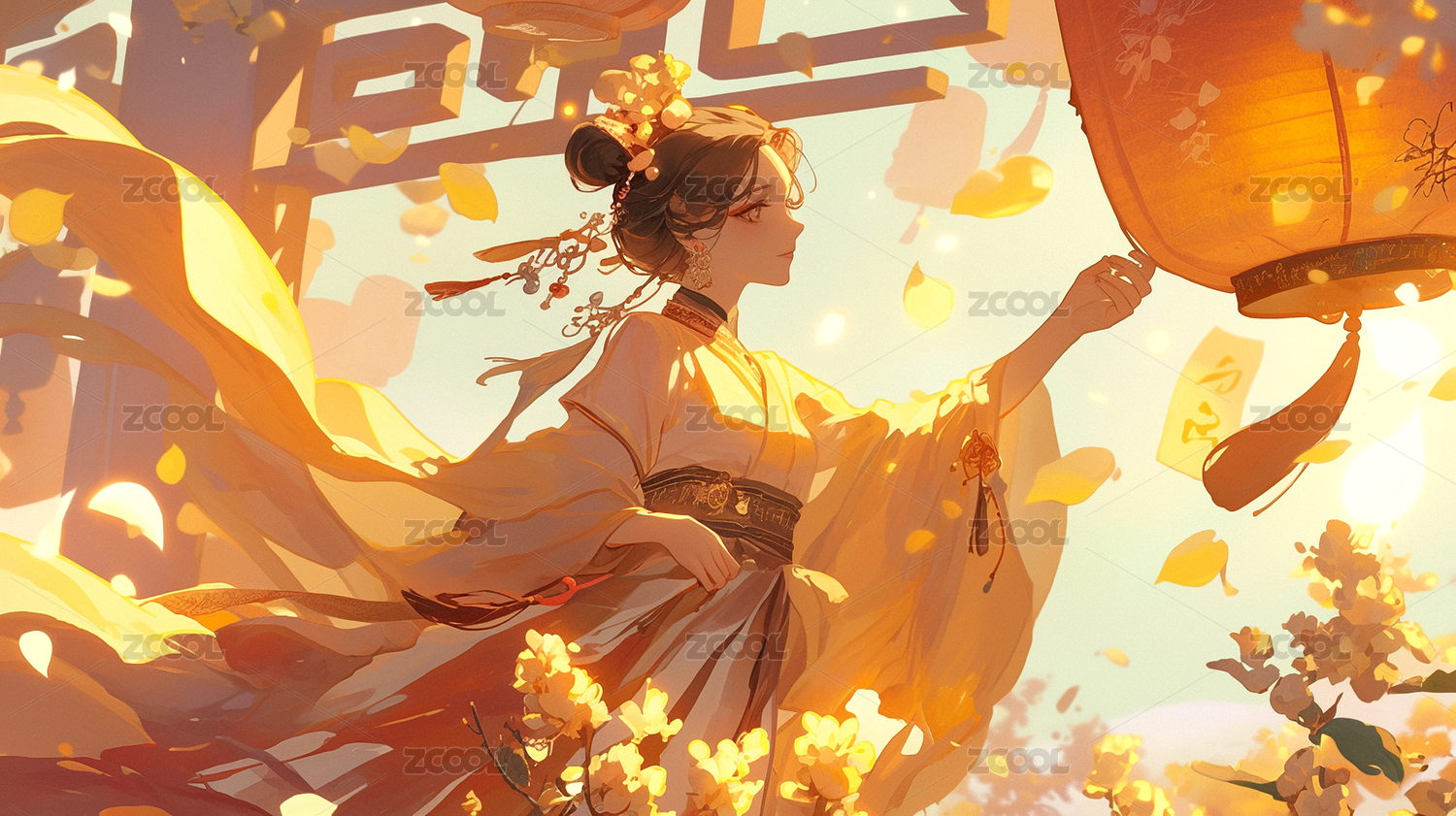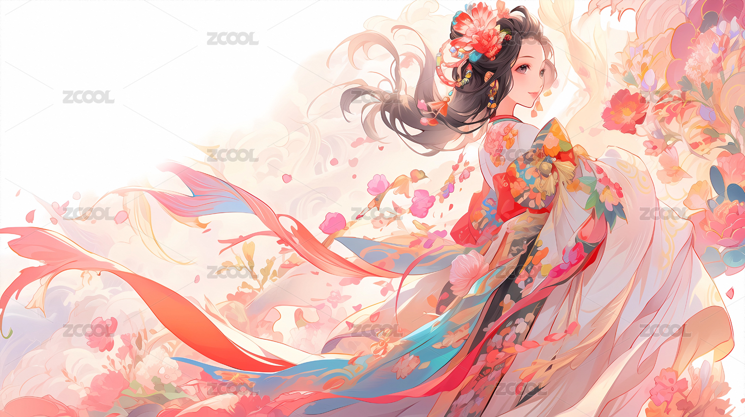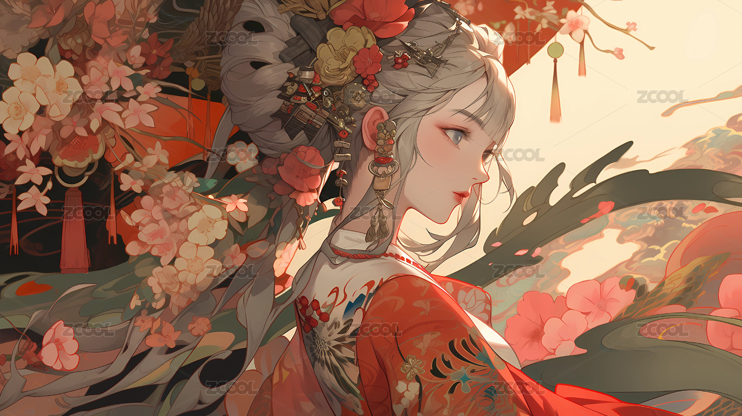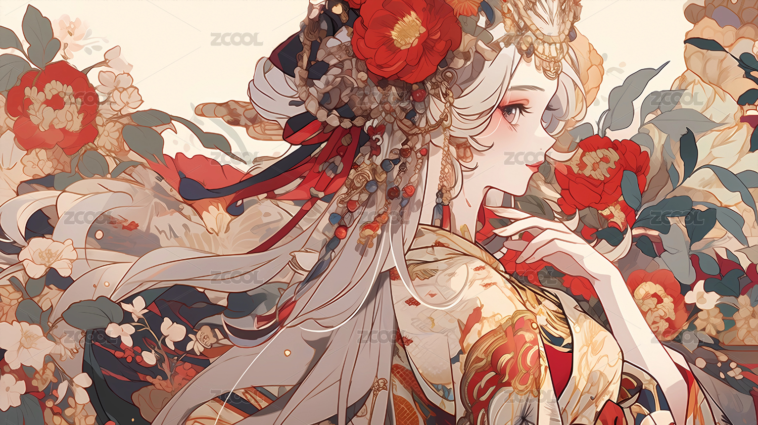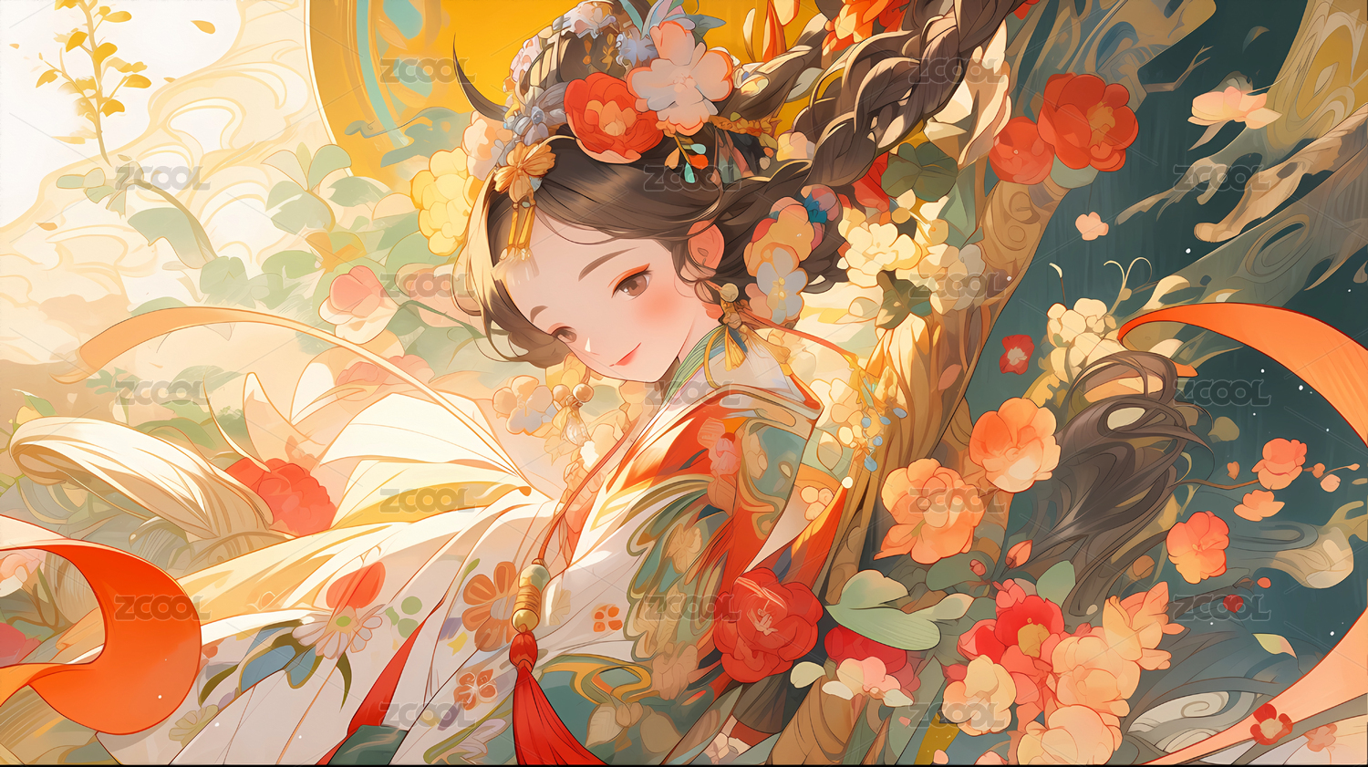 手绘,卡通,动漫,唯美,中国女孩,亚洲文化,女孩,亚洲女孩,盛装,吉祥