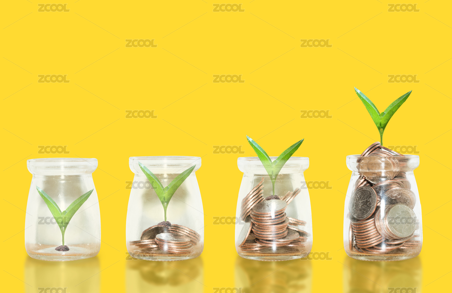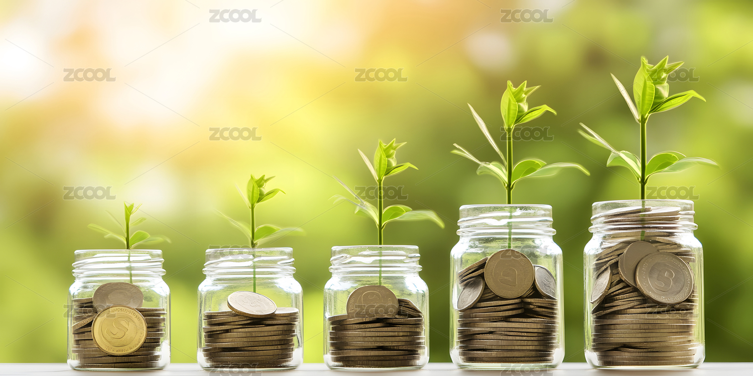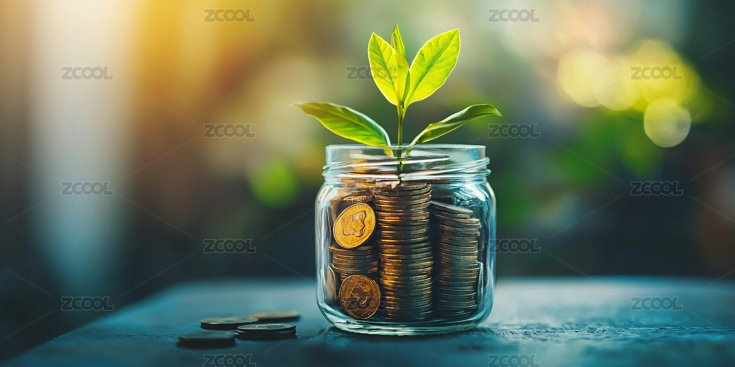 装满美元硬币的瓶子里长出绿植和一排递减的美元硬币
