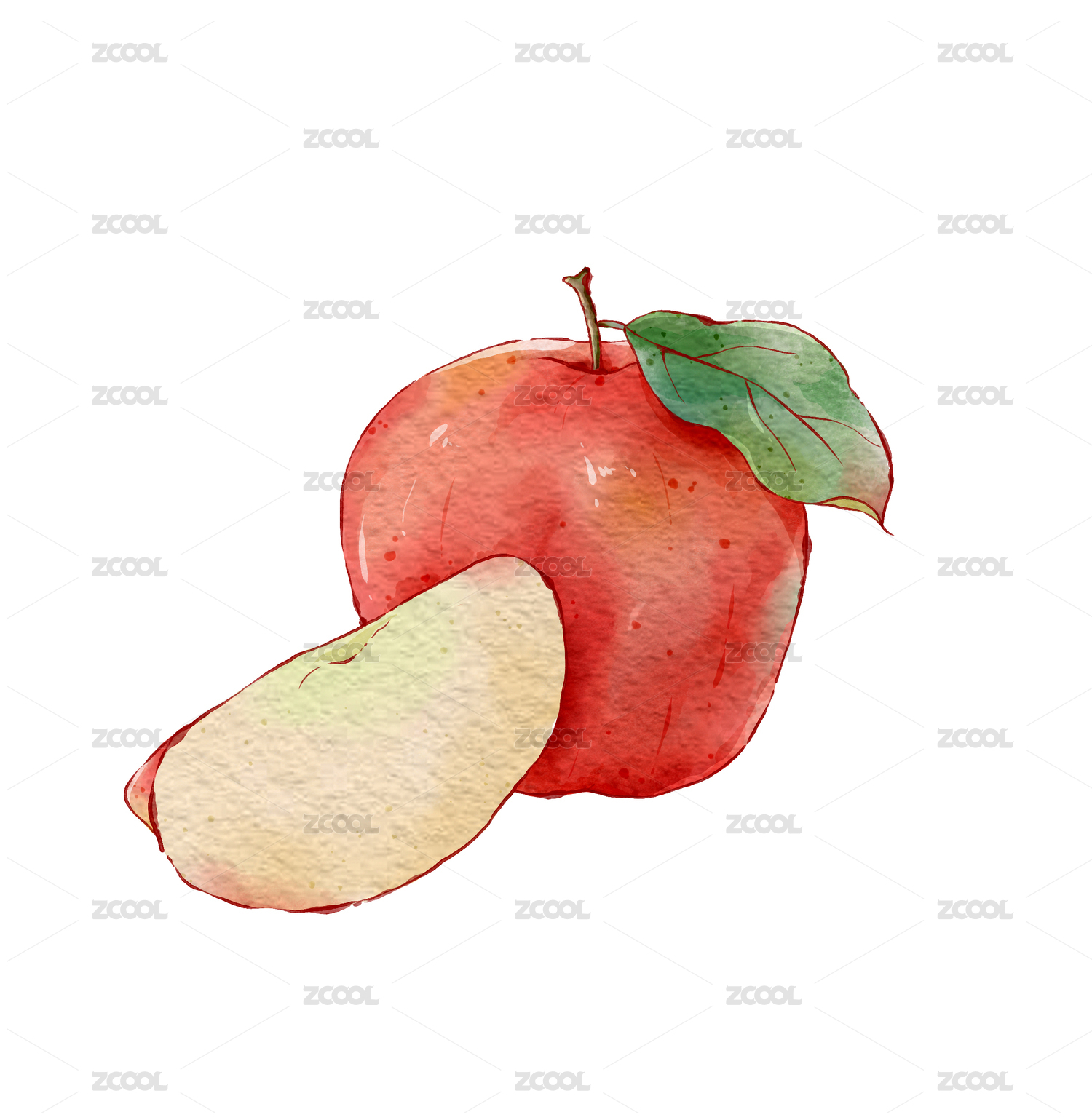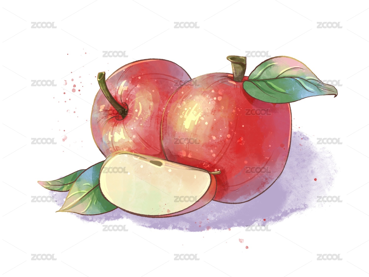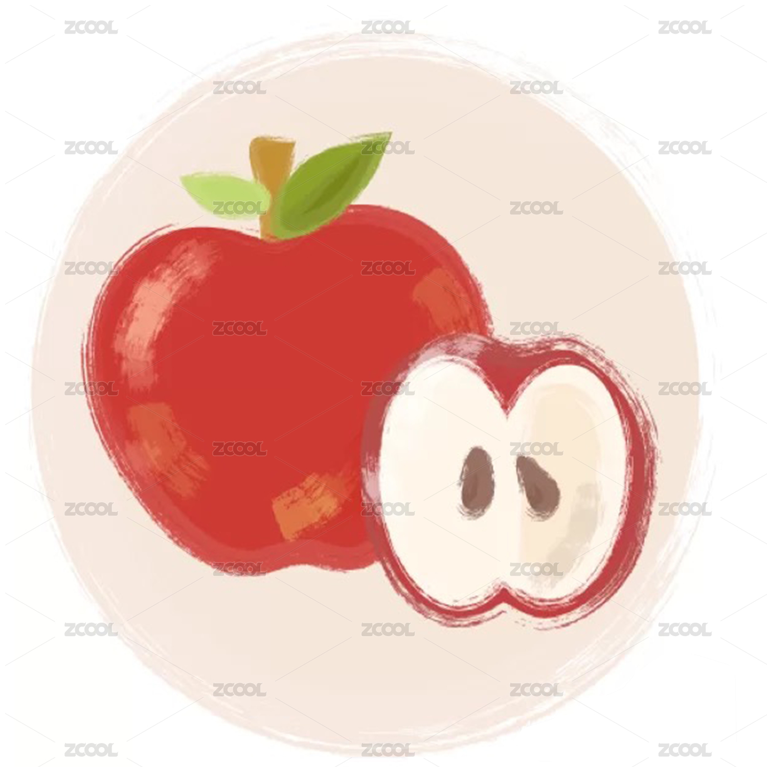 插画手绘苹果水果红苹果绿叶半个甜品好吃