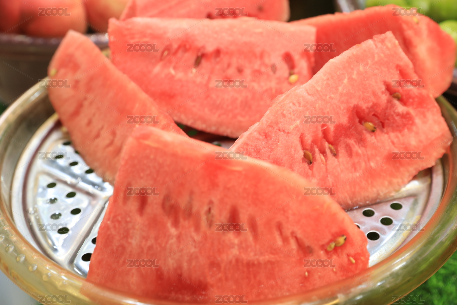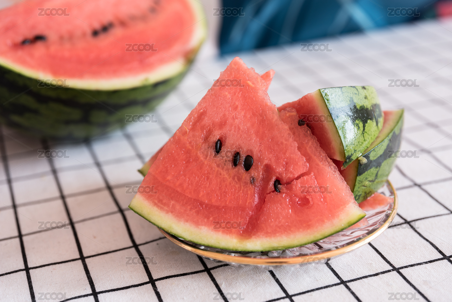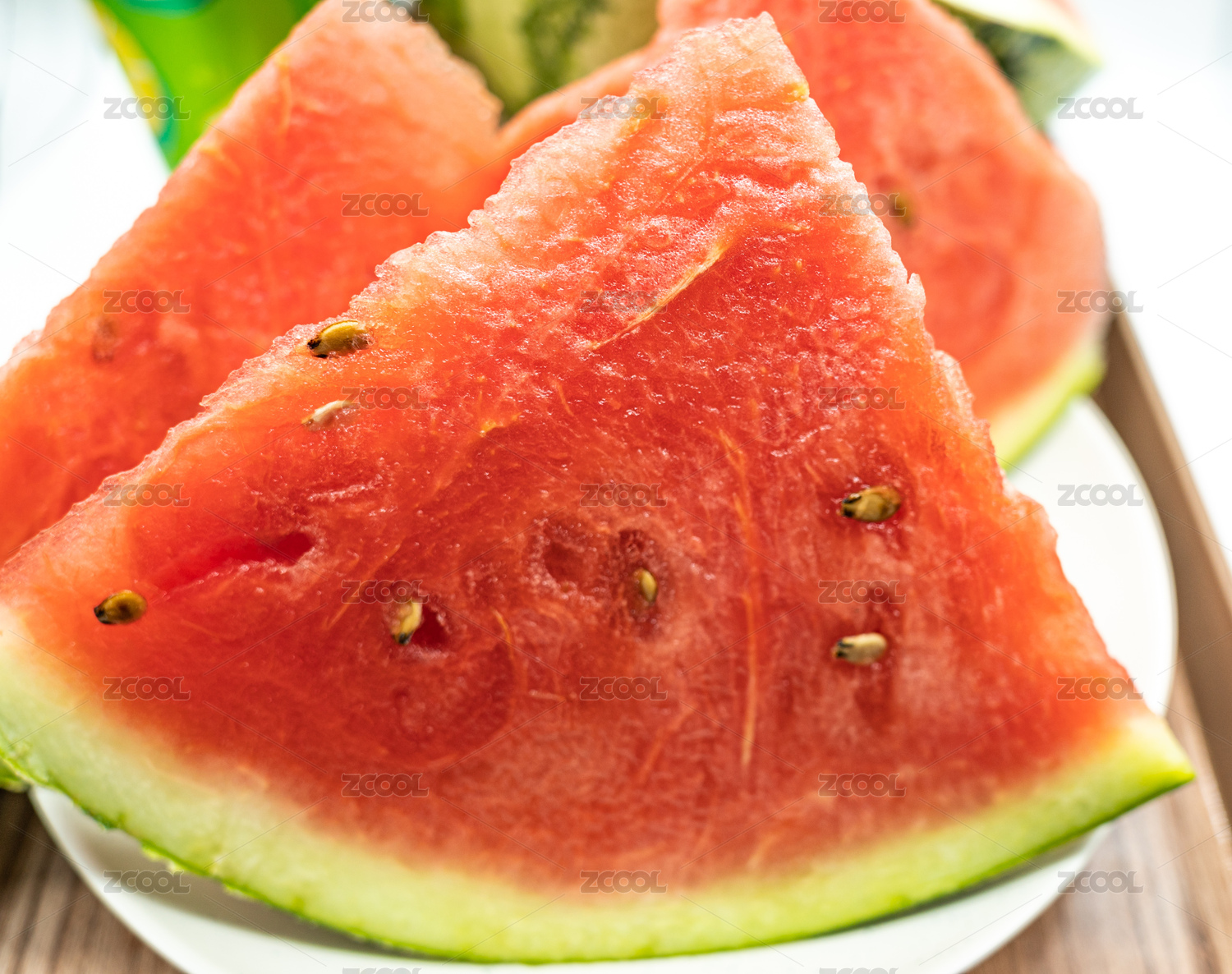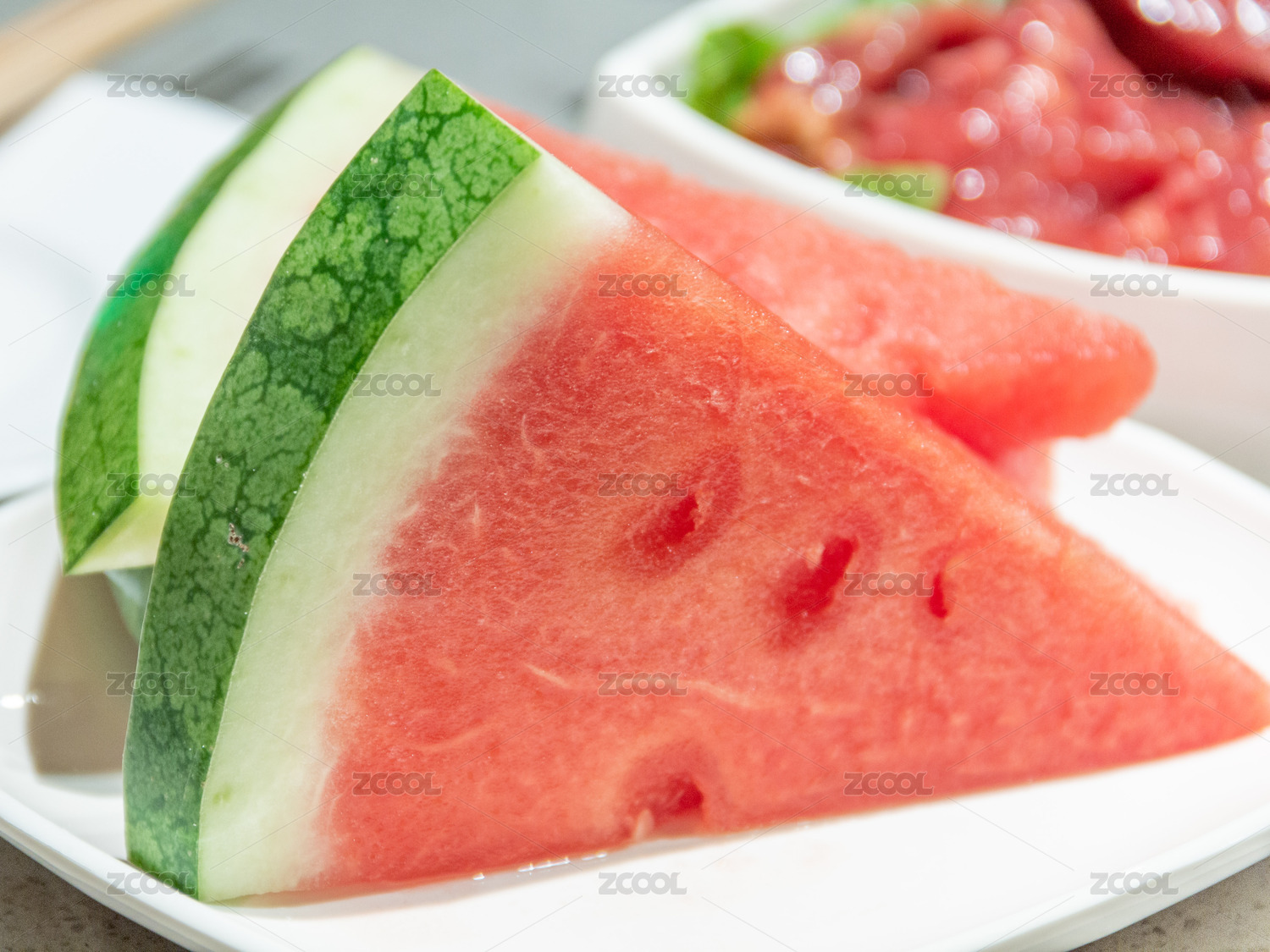 放在青花瓷盘里的多个冰镇新鲜西瓜特写