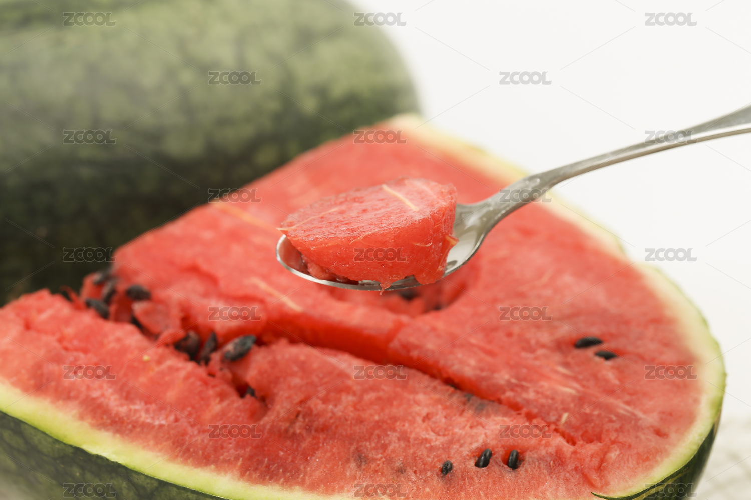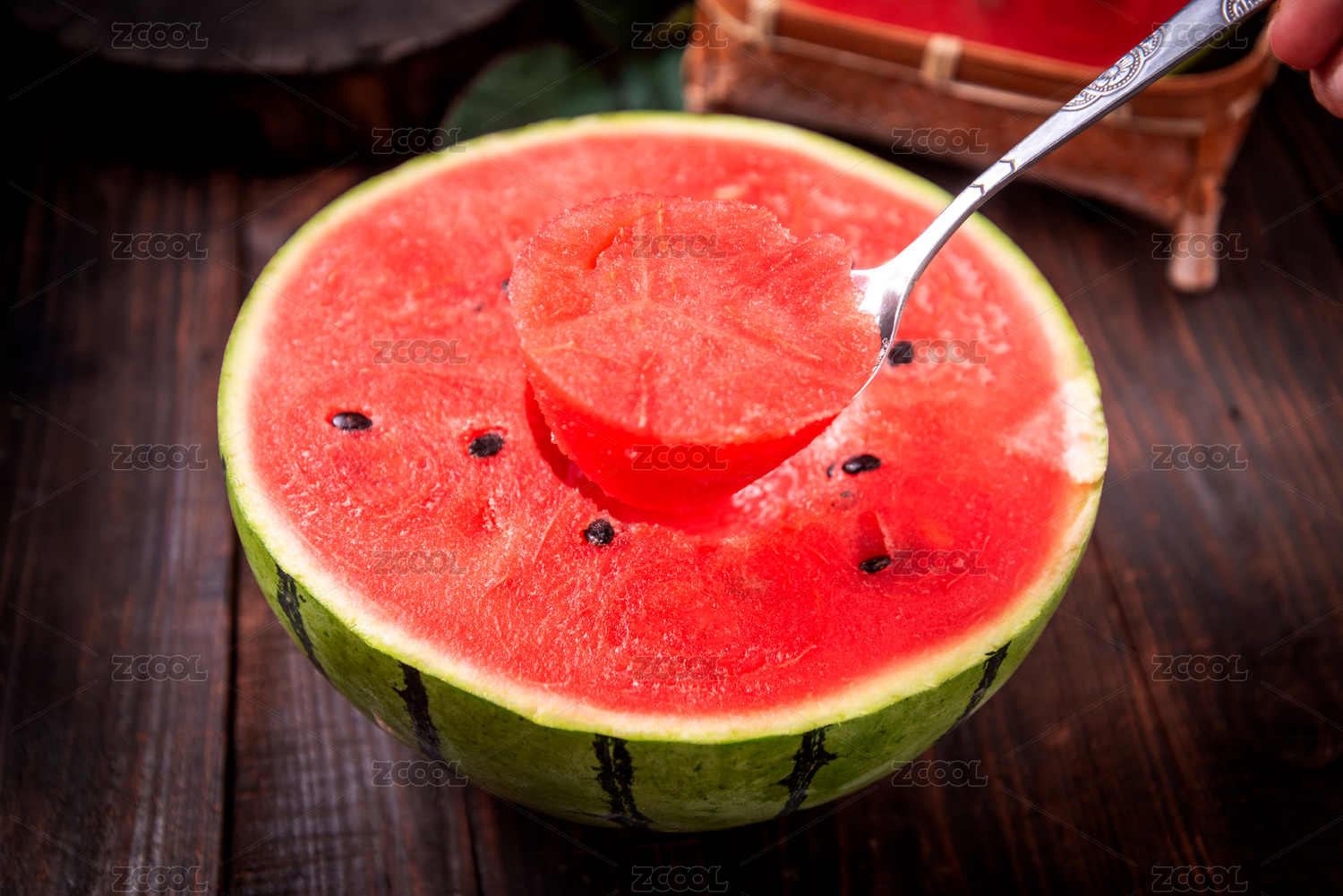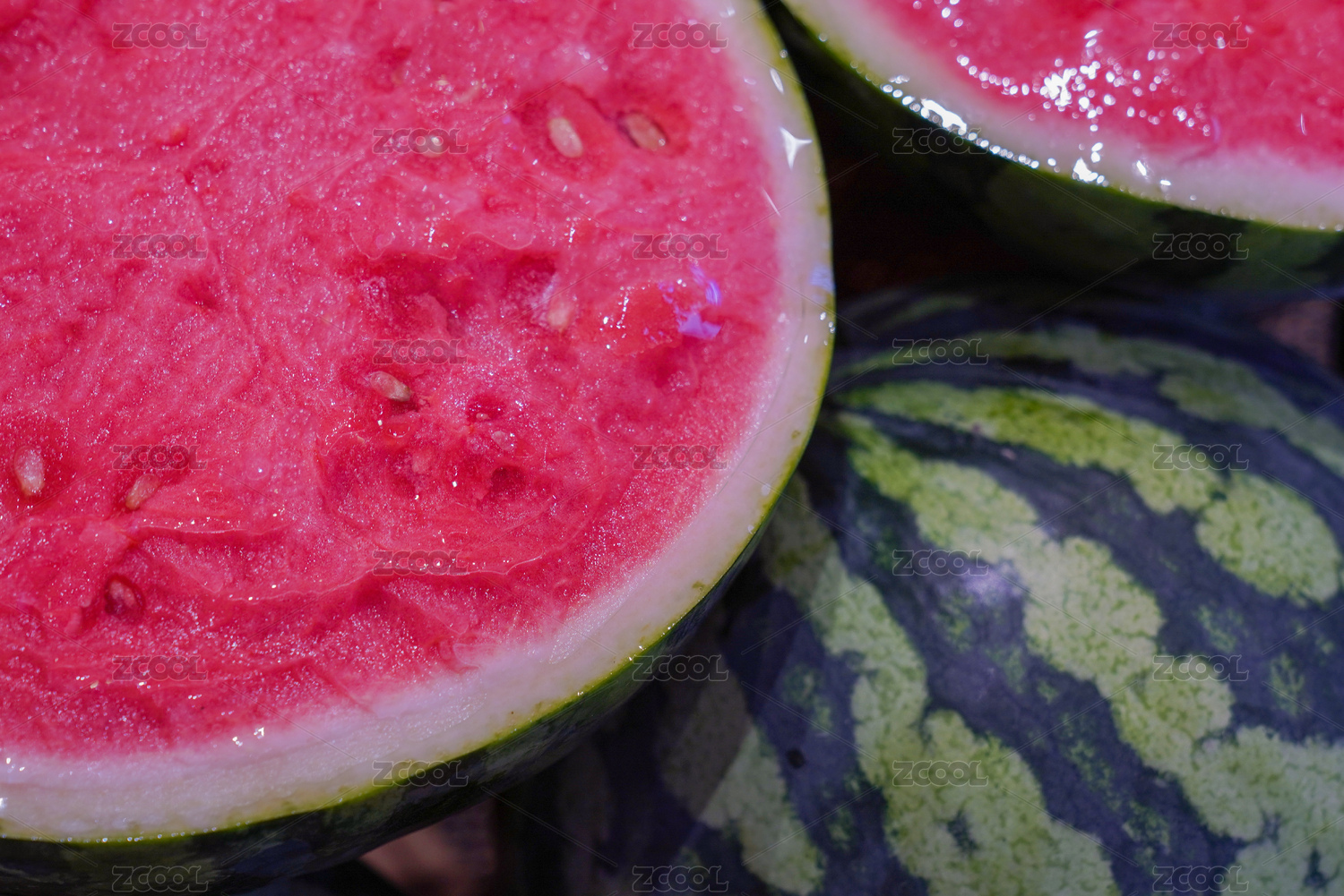 放在青花瓷盘里的多个冰镇新鲜西瓜特写