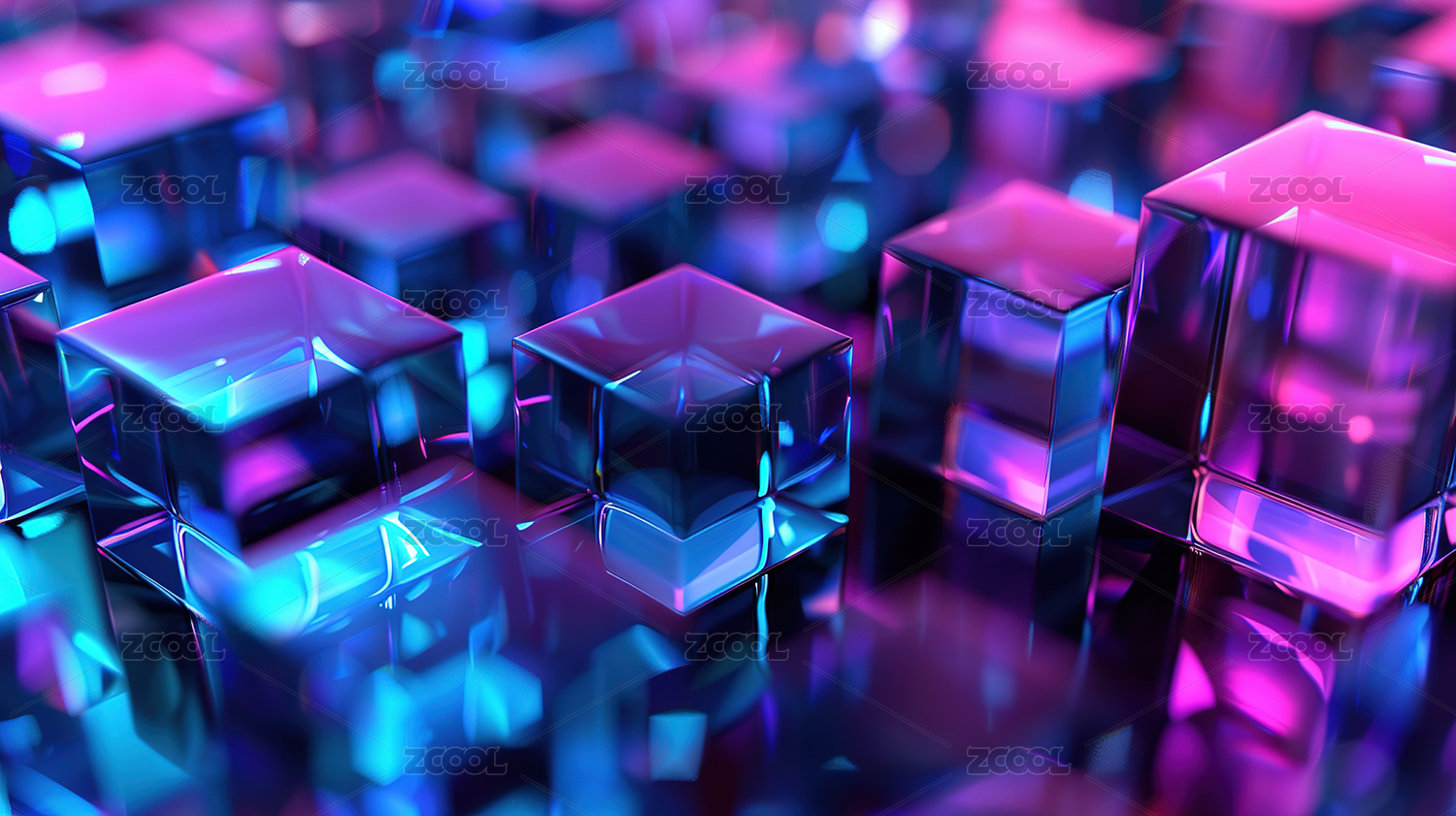 层叠排列荧光色立方体玻璃晶体3D立体插画