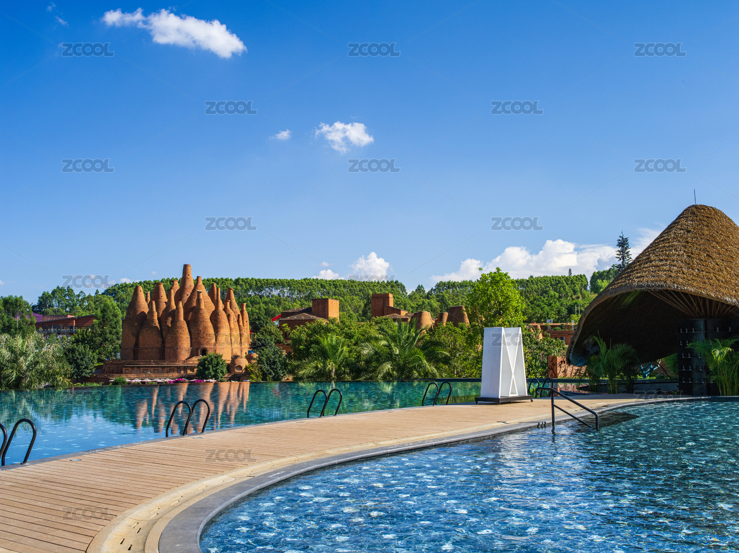 江苏南京郊外酒店室外蓝色游泳池周围设施