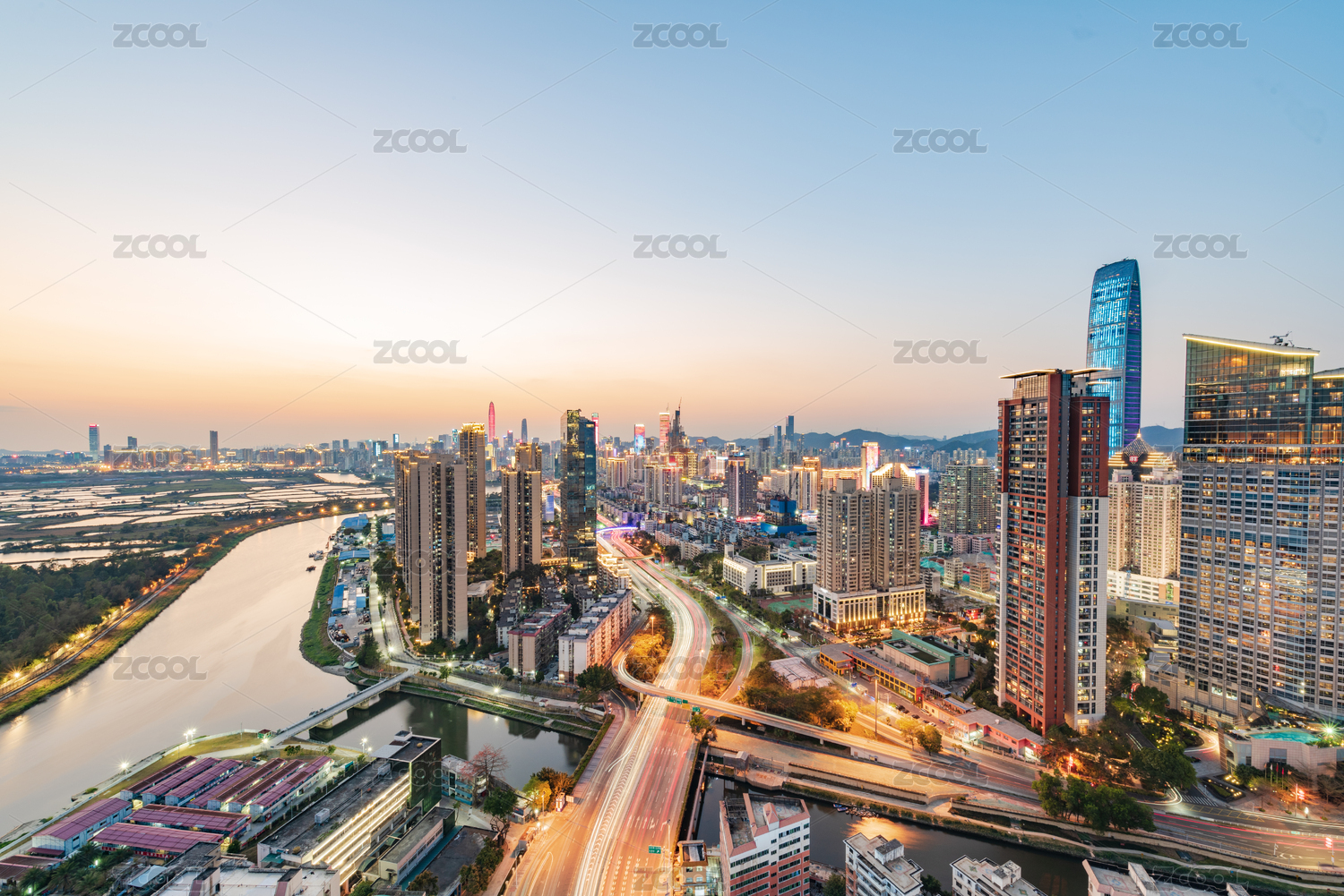 傍晚中国广东省深圳罗湖滨河路段天际线