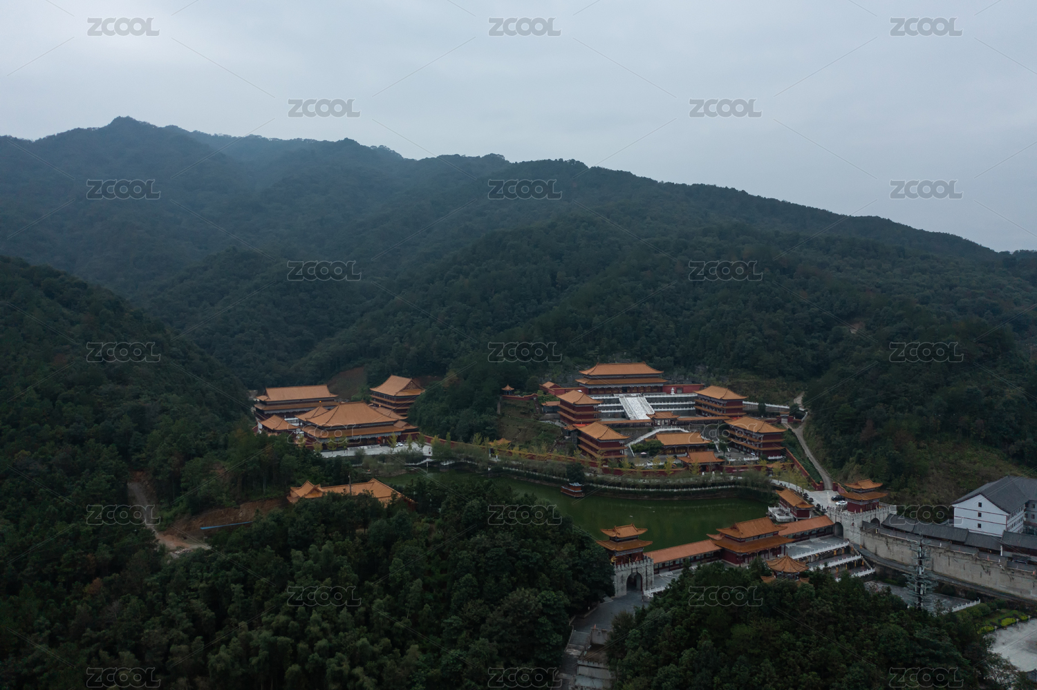 五岳衡山在大山深处的佛家庙宇园林建筑群风光