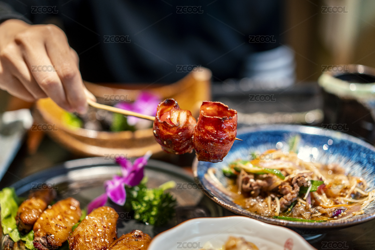 几个人用筷子夹餐桌上的蜜汁叉烧