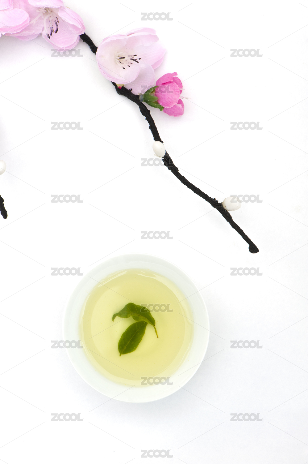 白瓷杯子中的一片乌牛早绿茶茶叶