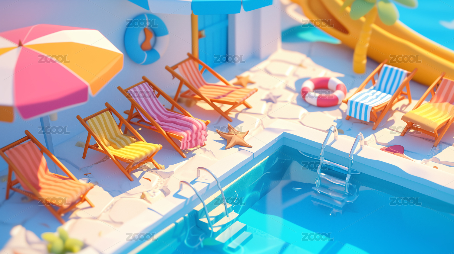 夏天,白天,游泳池,特写,3D,卡通,蓝天,遮阳伞,躺椅,沙滩椅