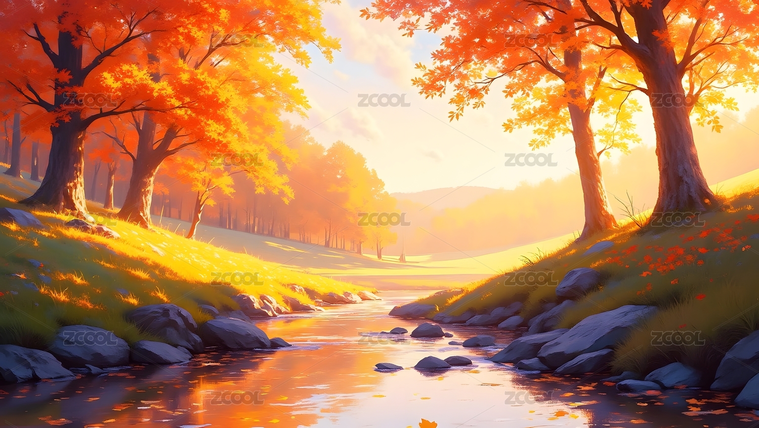秋天白天阳光明亮的金黄色原野3D插画背景