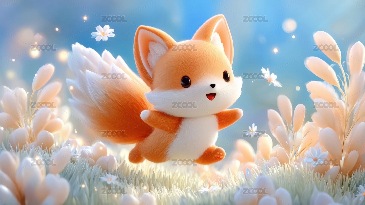 一只可爱的柴犬在白色花丛微笑奔跑手绘插画