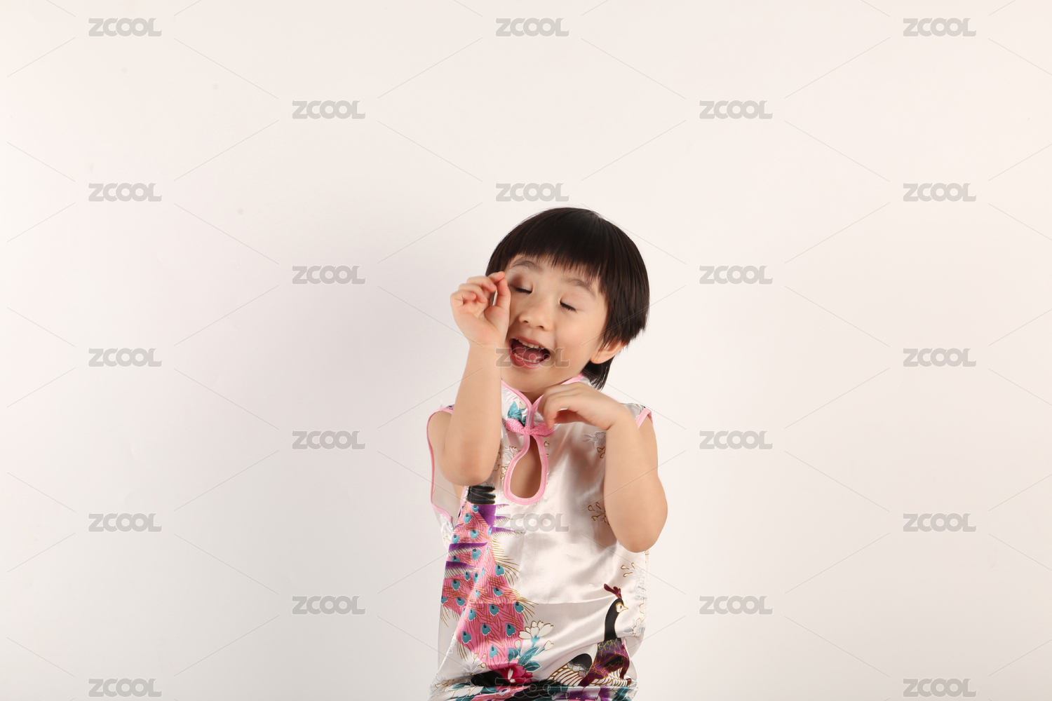 中国女宝宝穿旗袍坐着伸手