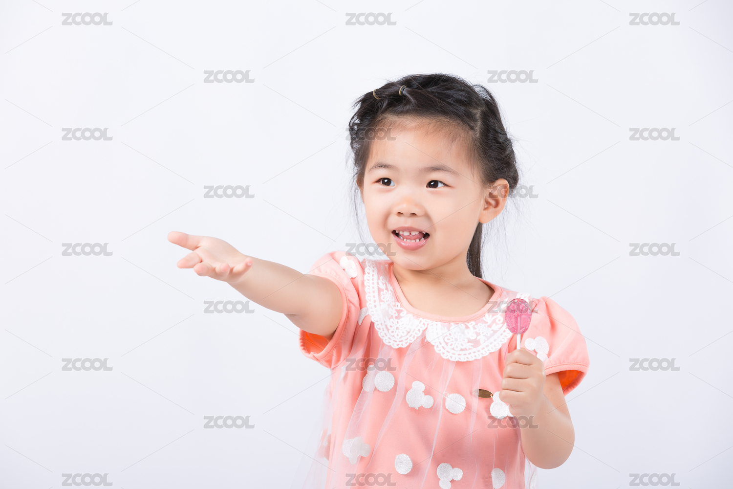 白色背景下手拿棒棒糖额中国女童