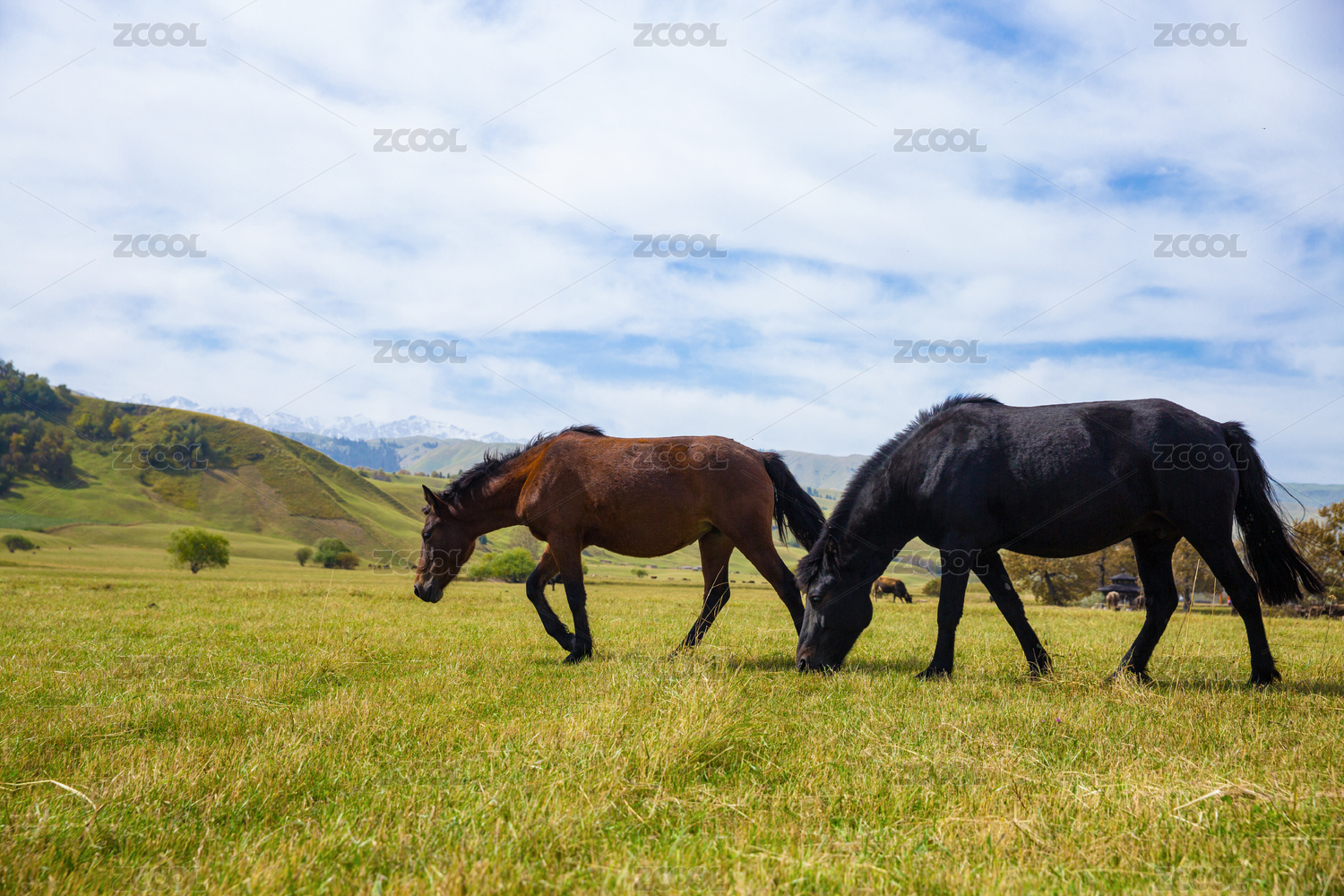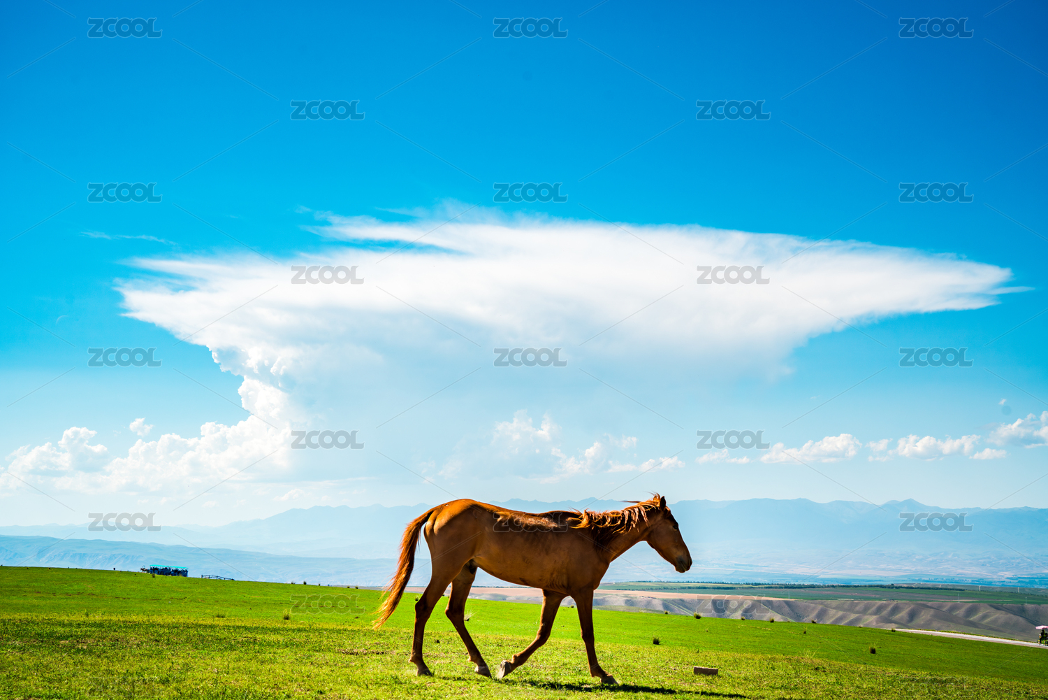 中国新疆草原蓝天白云骏马自然风景