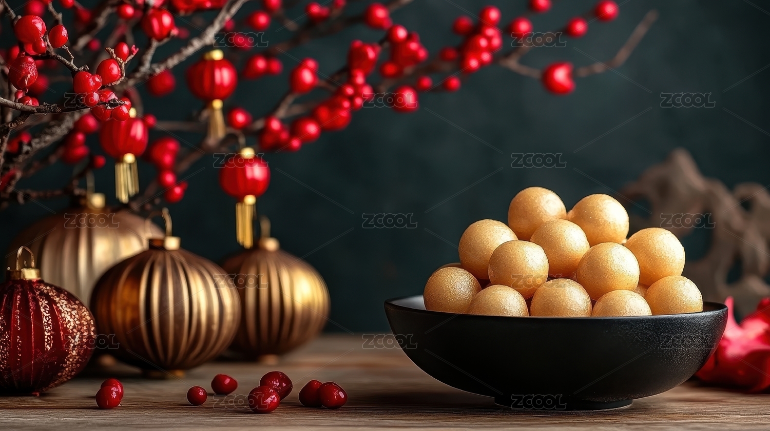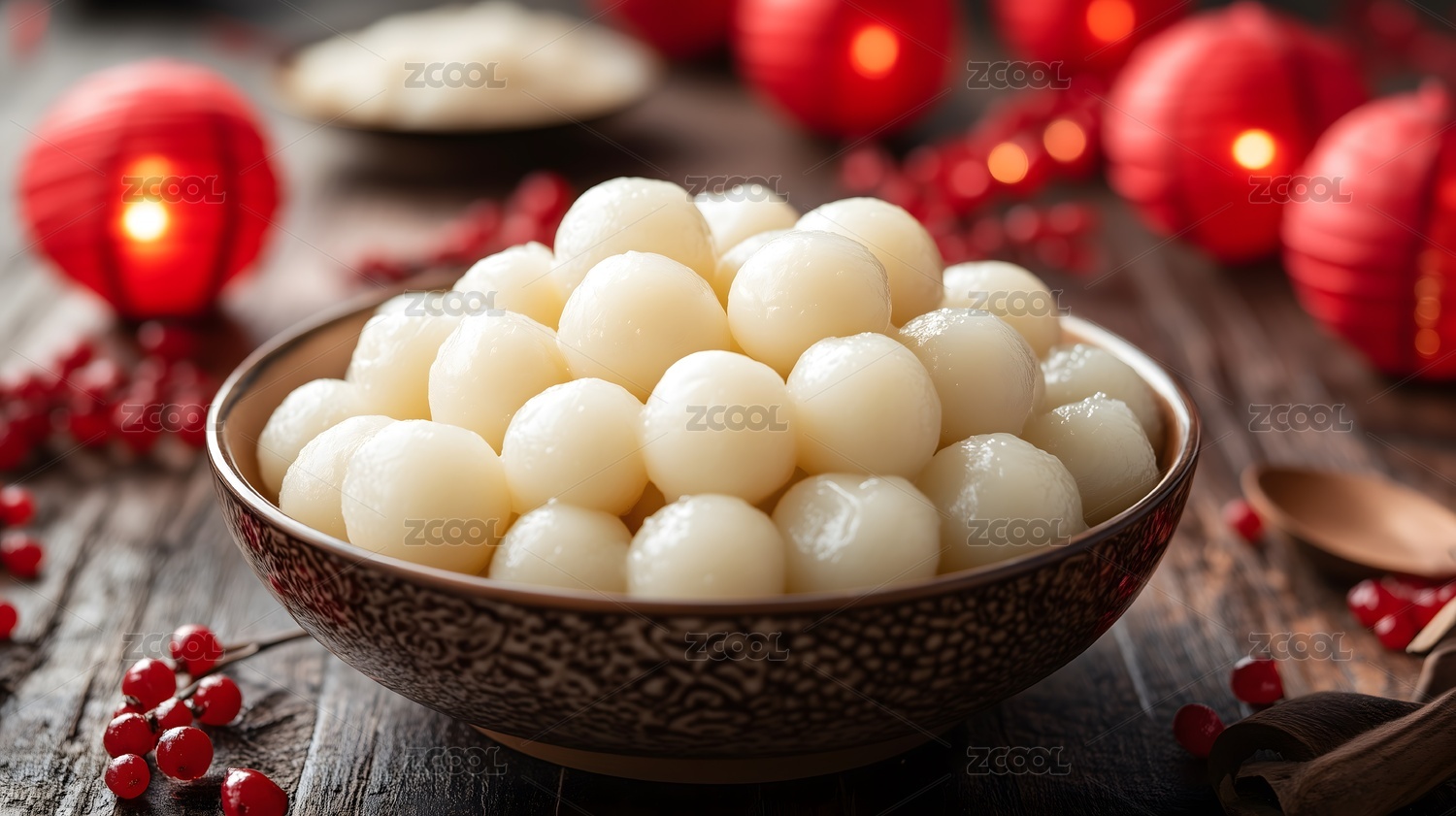 新春佳节白色汤圆,红果喜庆,灯笼高挂