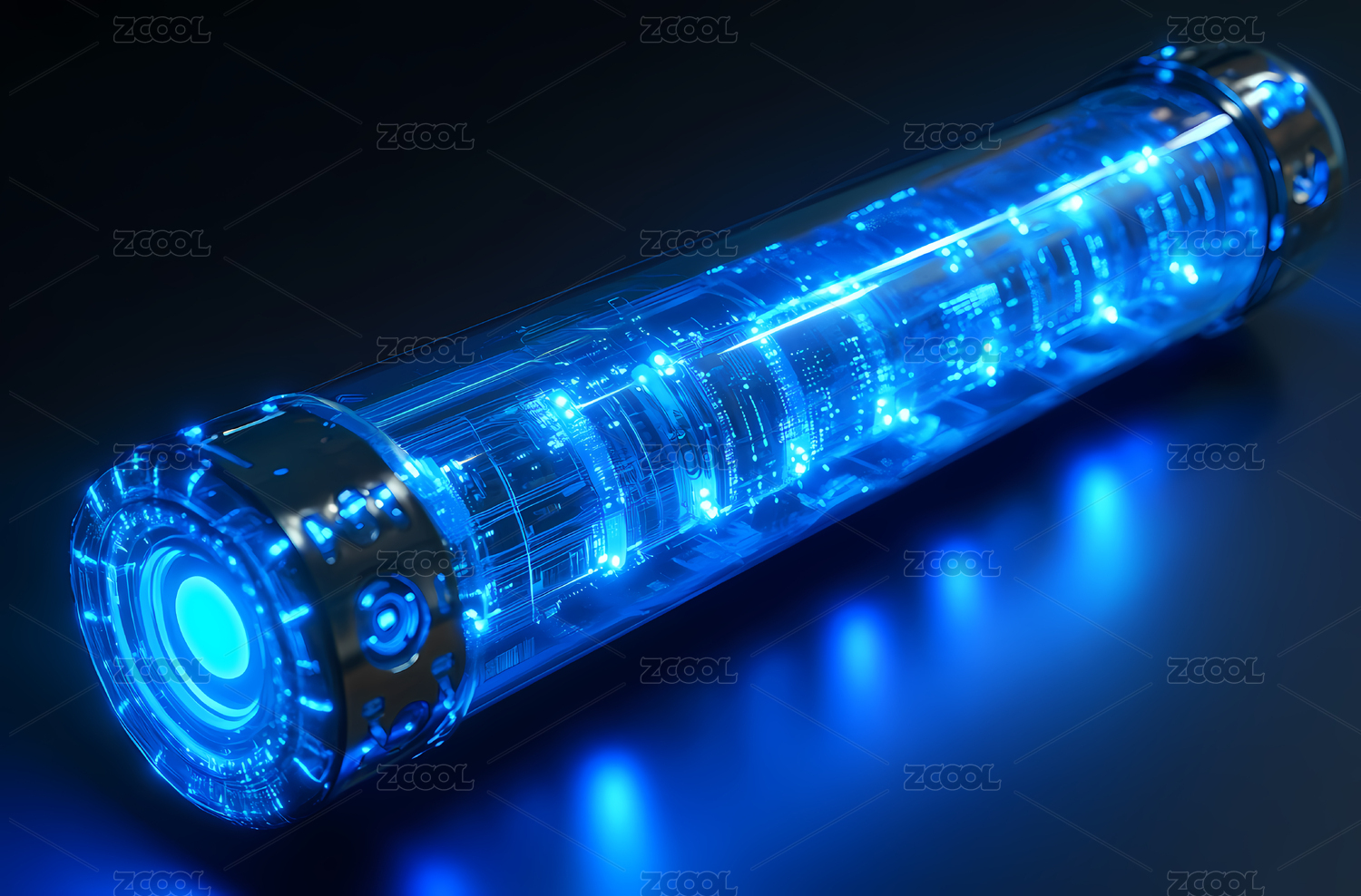 透明圆柱体散发着蓝色光芒