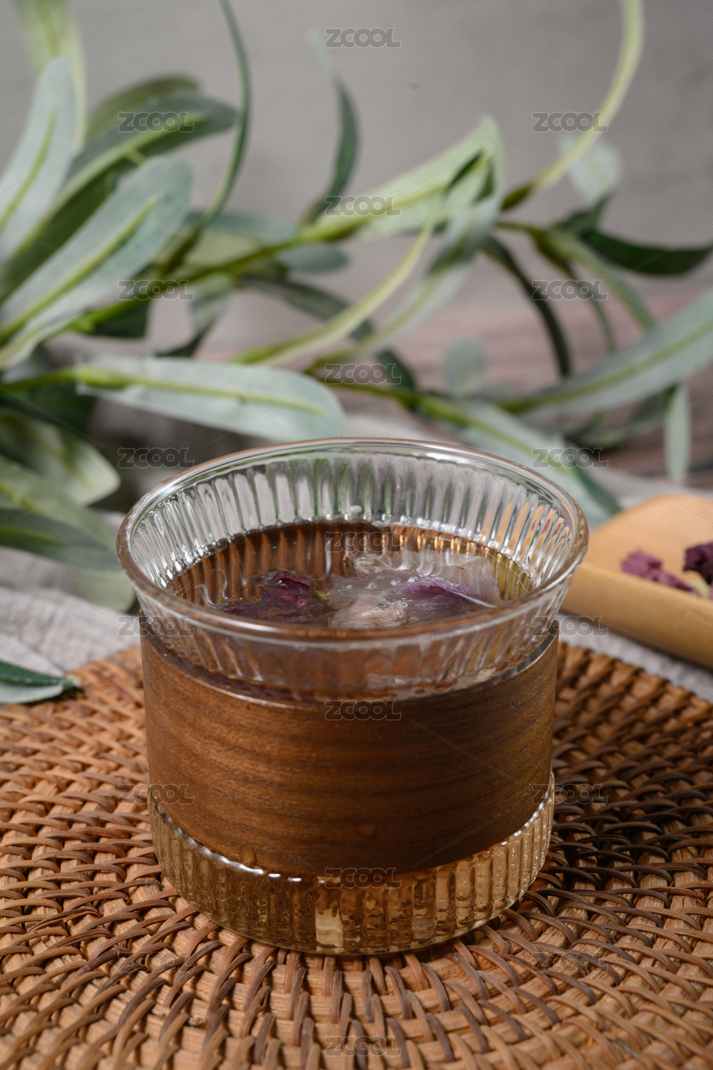 桌面上的杯子里的香甜可口的牡丹花苞茶