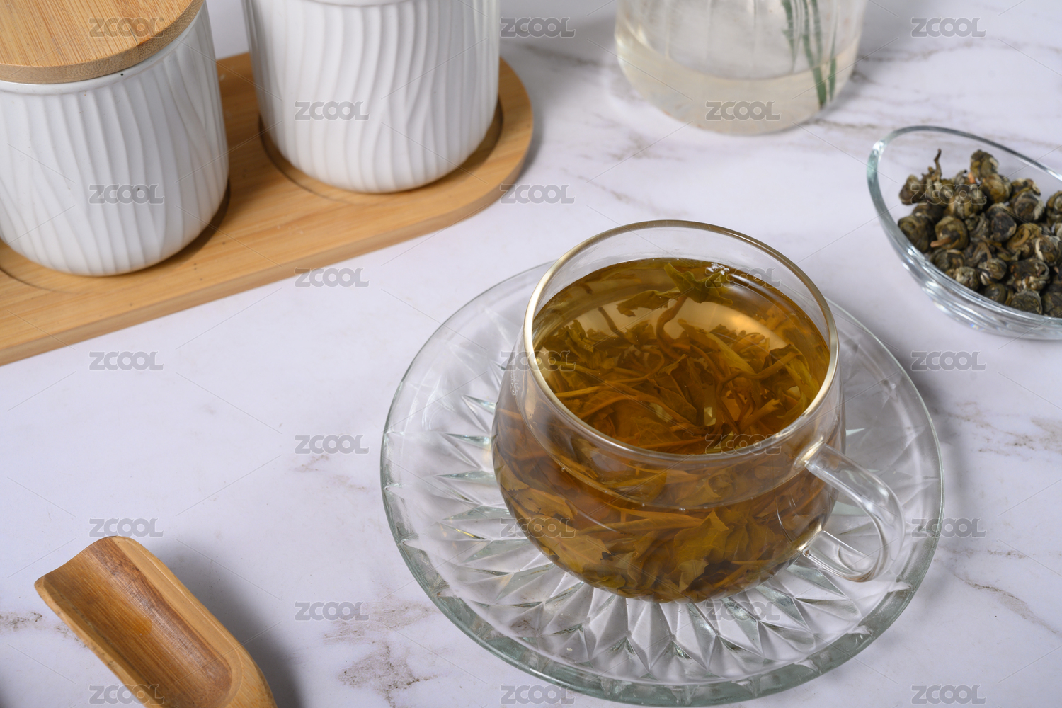 桌面上的玻璃杯子里的生津止渴的茉莉花绿茶