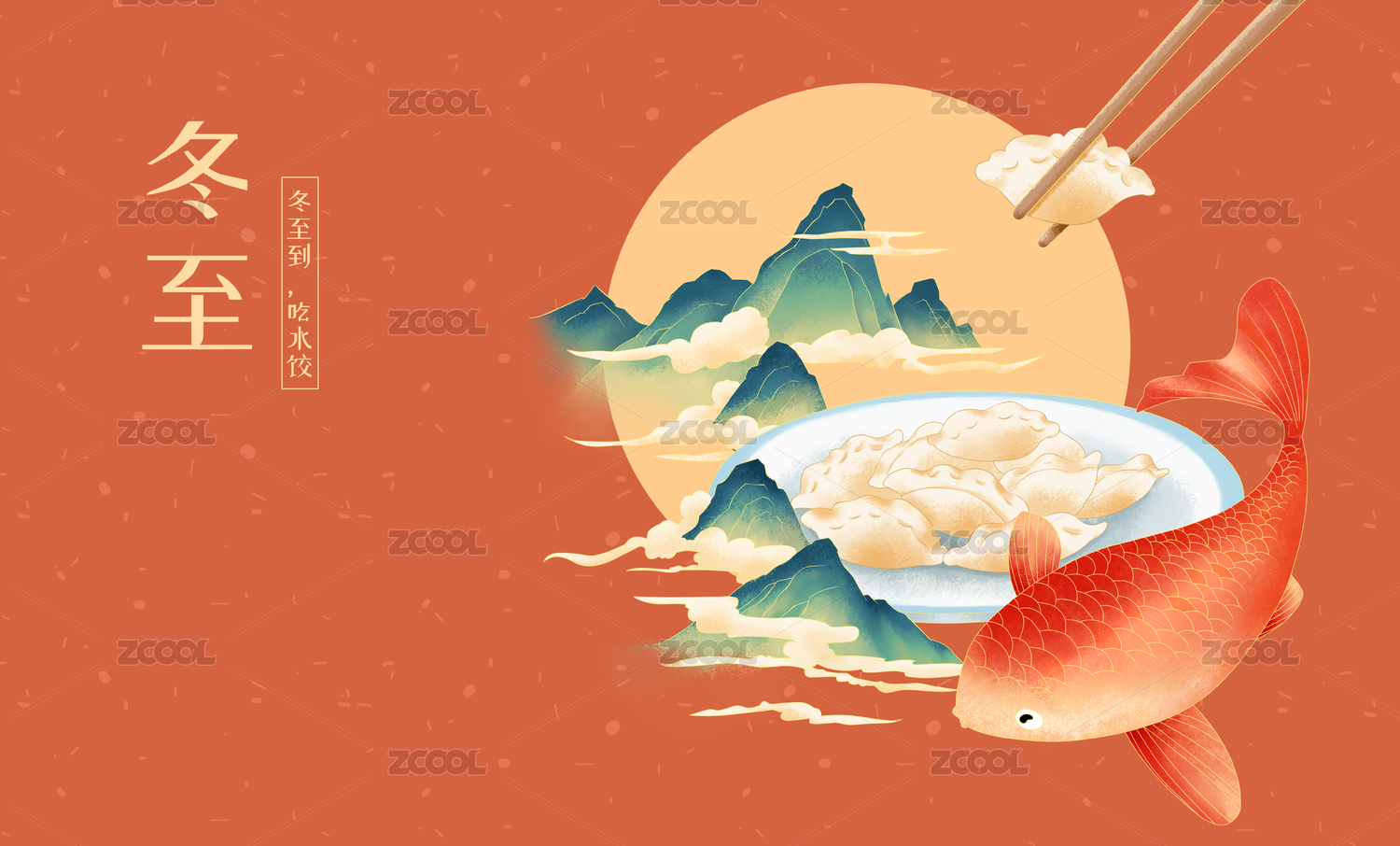 饺子在锦鲤和中国风山水中间抽象插画 横版
