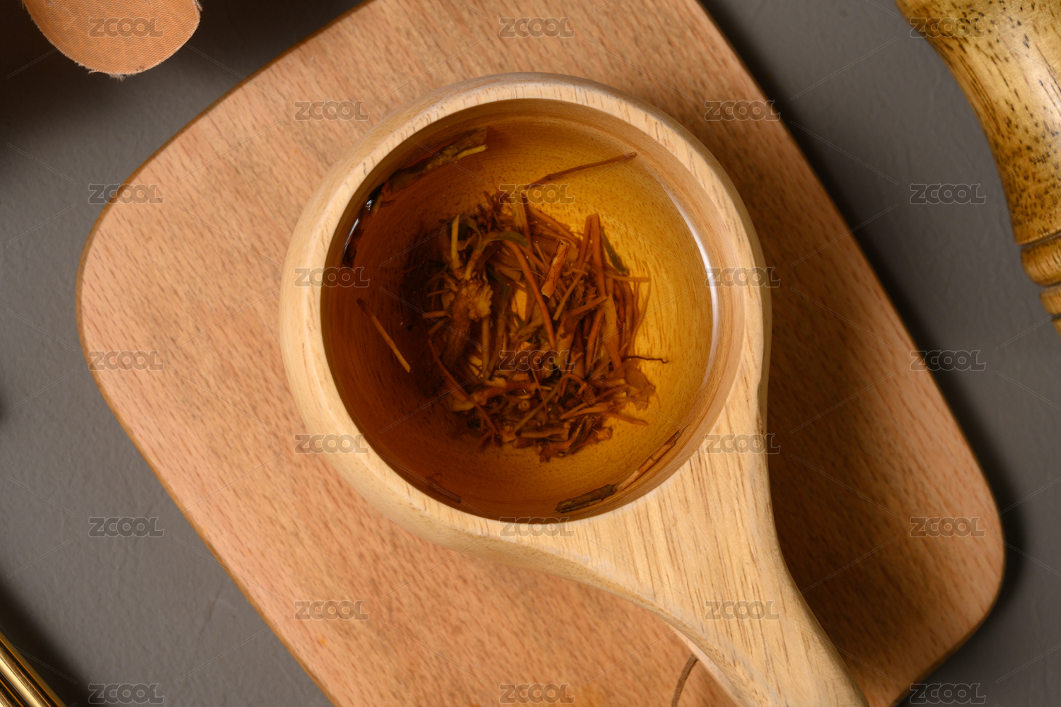 桌面上个的杯子里的甘甜可口的龙胆草茶