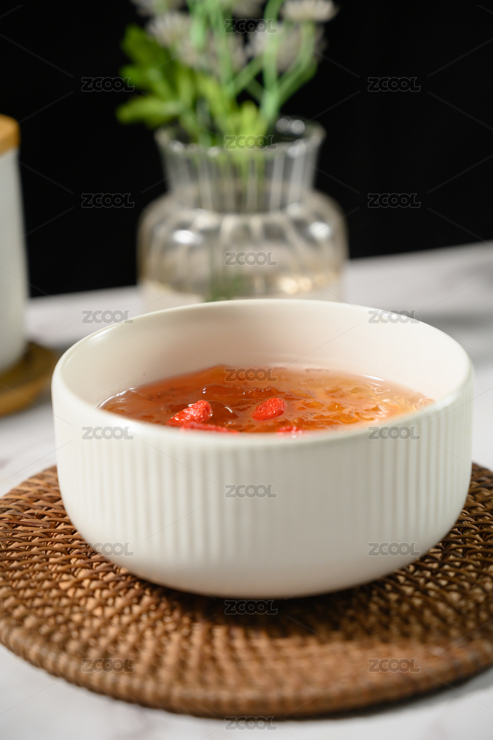 桌面上的盘子里的美味可口的冰糖炖桃胶