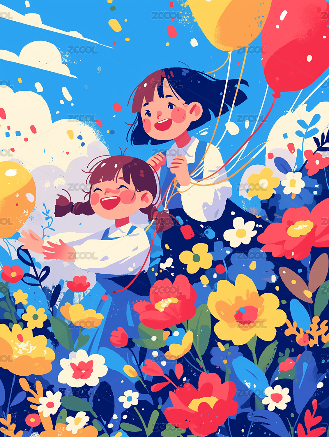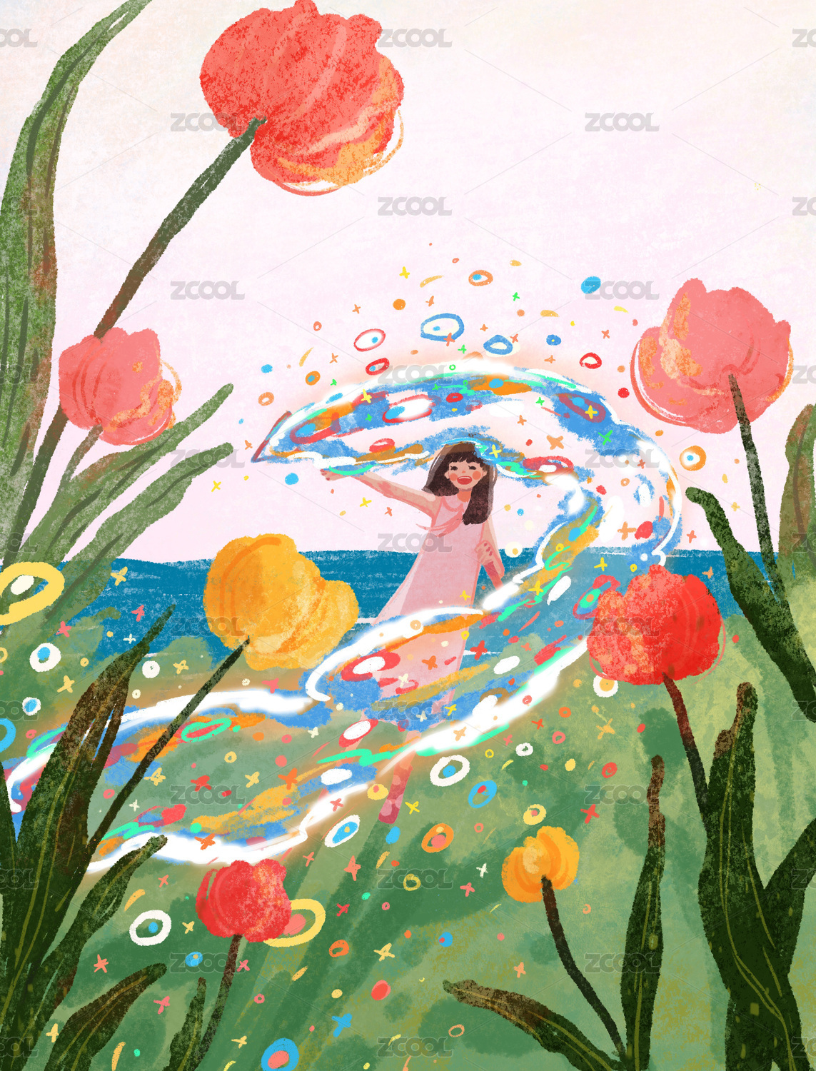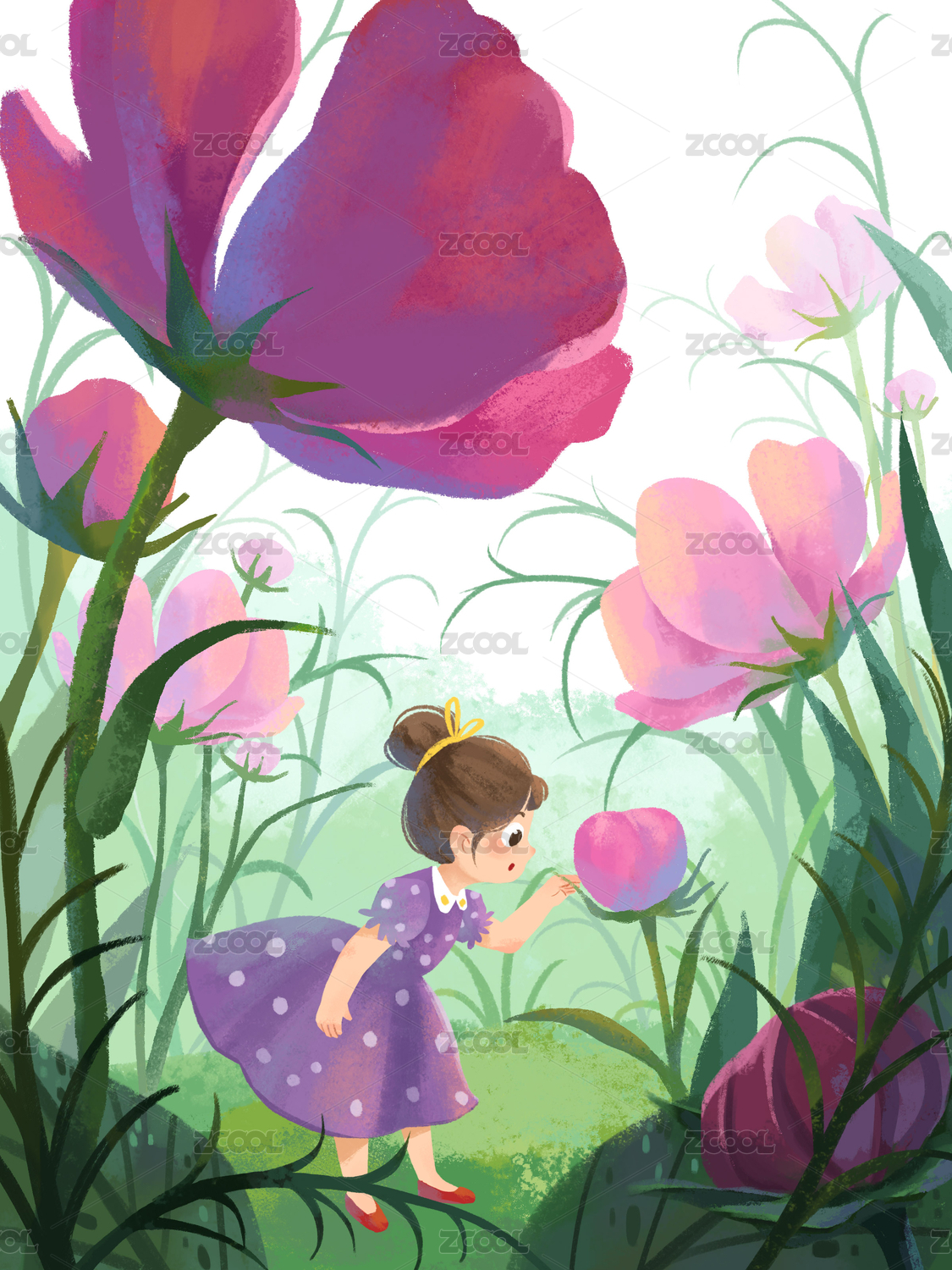 花与女孩儿童手绘插画