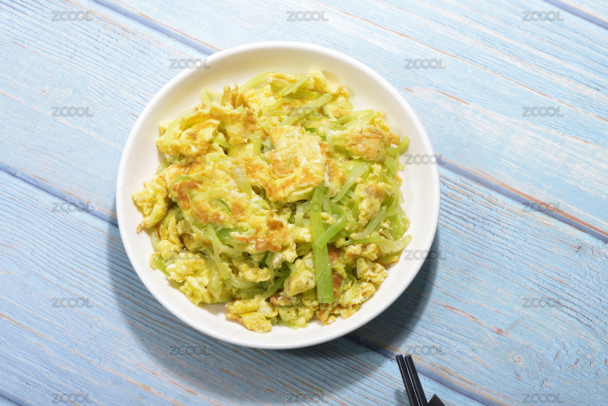 木桌背景一盘家常菜苦瓜炒鸡蛋