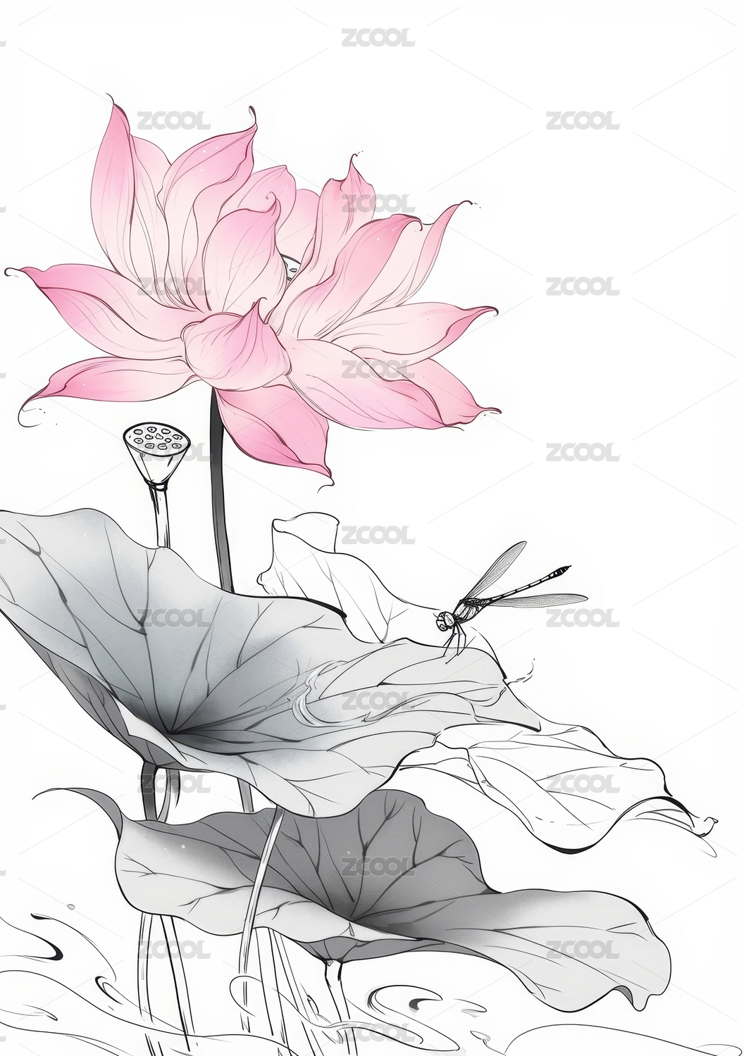 国风荷花线描插画