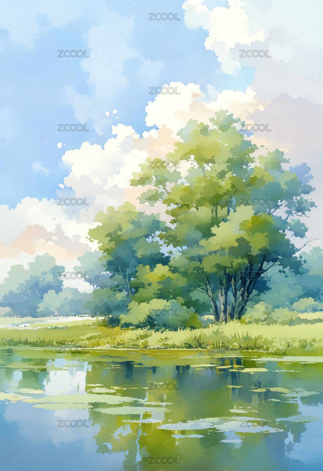 手绘卡通蓝色天空下的森林湖泊风景插画