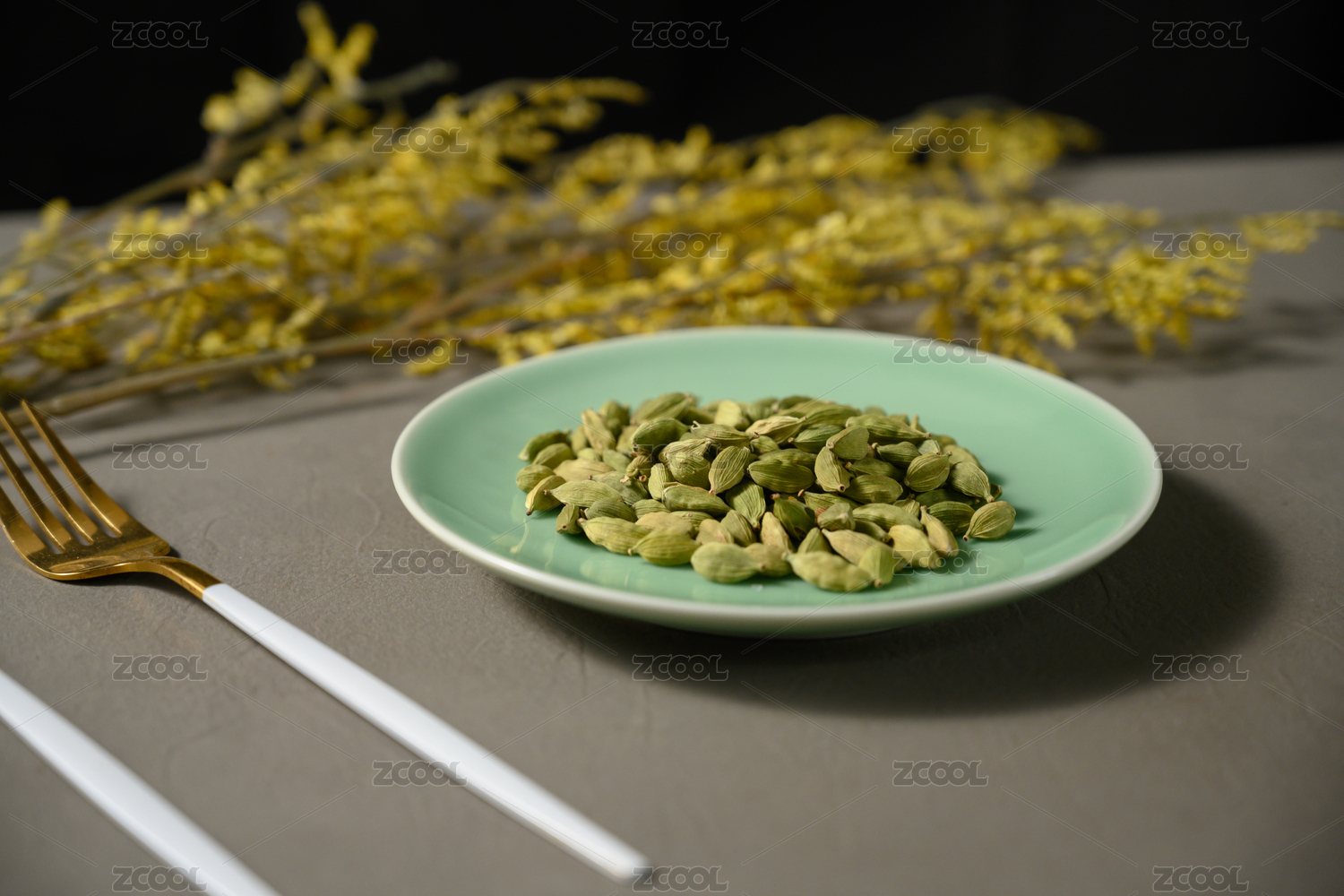 桌面上的盘子里的香气四溢的绿豆蔻
