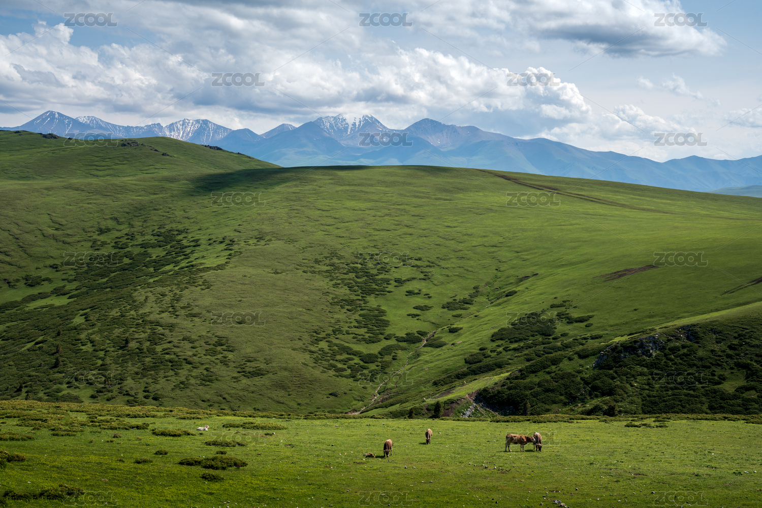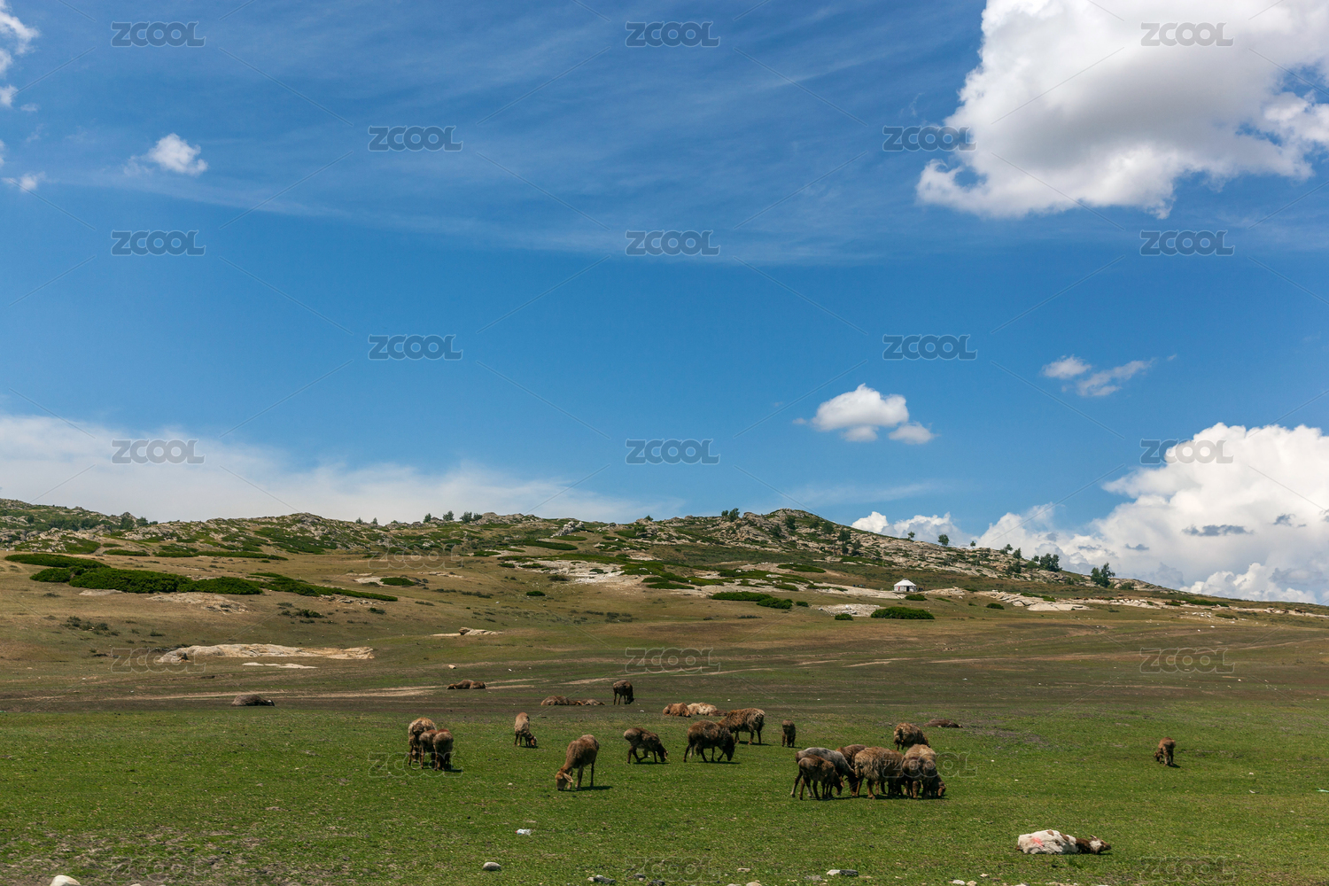 夏季蓝天白云下新疆放牧中的动物