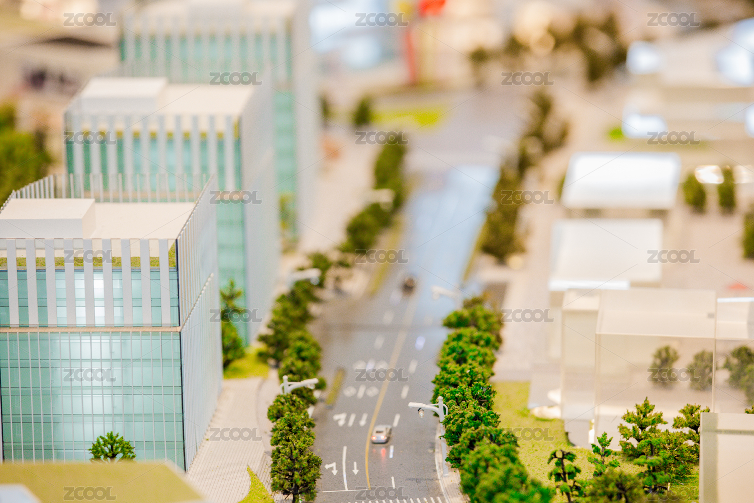 房产沙盘里有汽车行驶的道路及行道树绿地楼房等模型