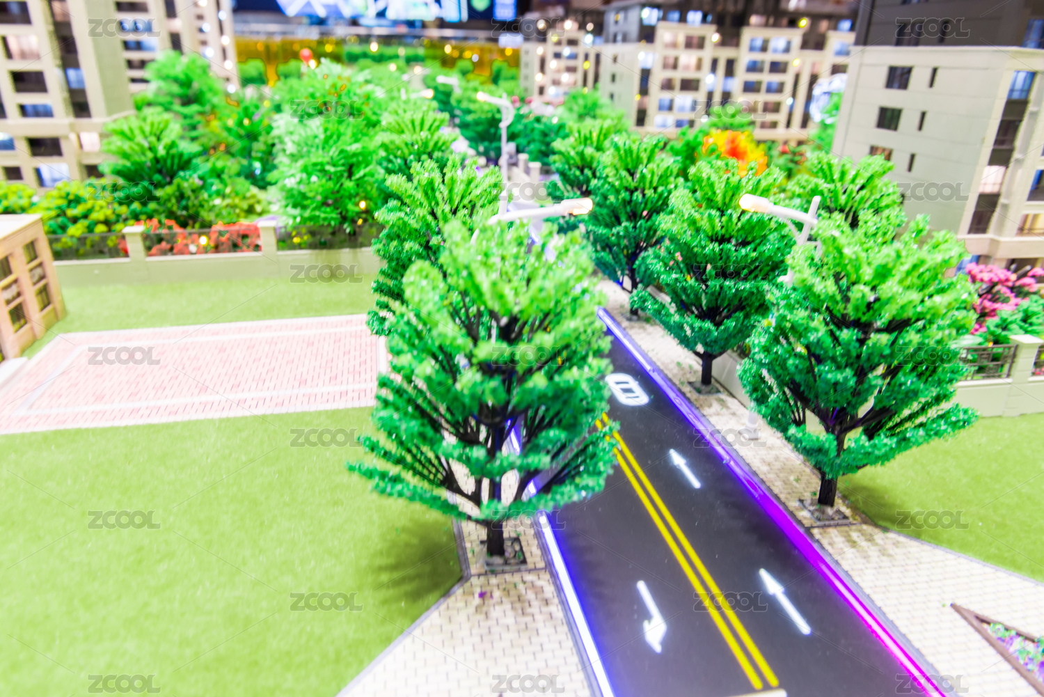 房产沙盘里有汽车行驶的道路及行道树绿地等模型