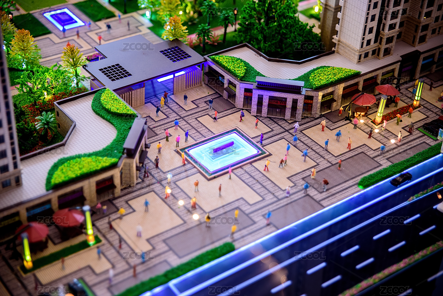 房地产售楼处建筑模型沙盘中住宅小区商业街区建筑规划场景局部特写
