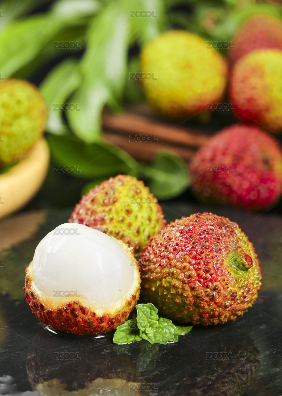 黑底上放着新鲜妃子笑和妃子笑果肉
