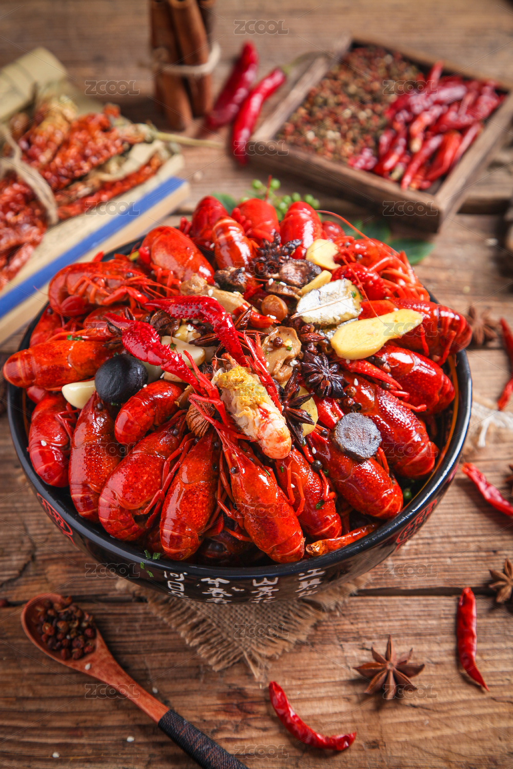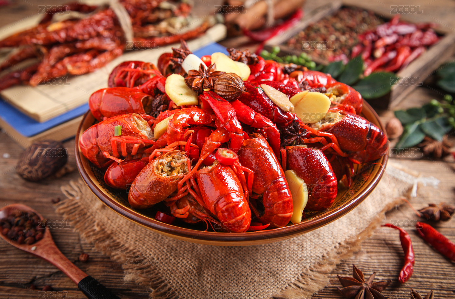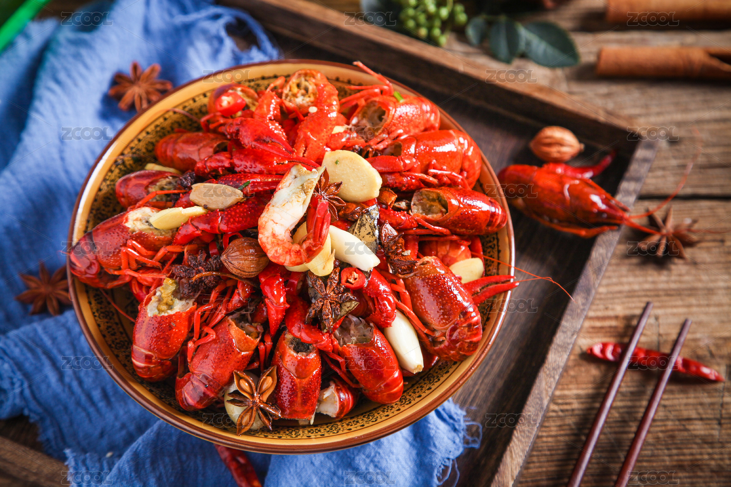 木纹底上装在白盘子里的麻辣油爆小龙虾