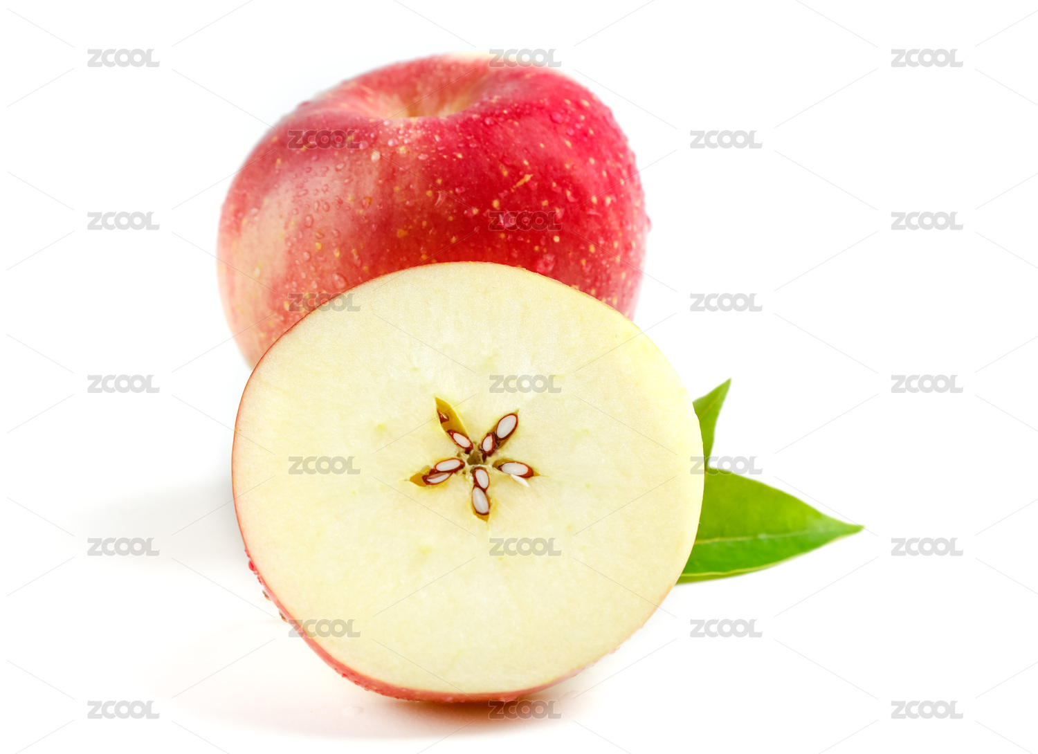 白底上放着新鲜秦冠丑苹果和苹果果肉