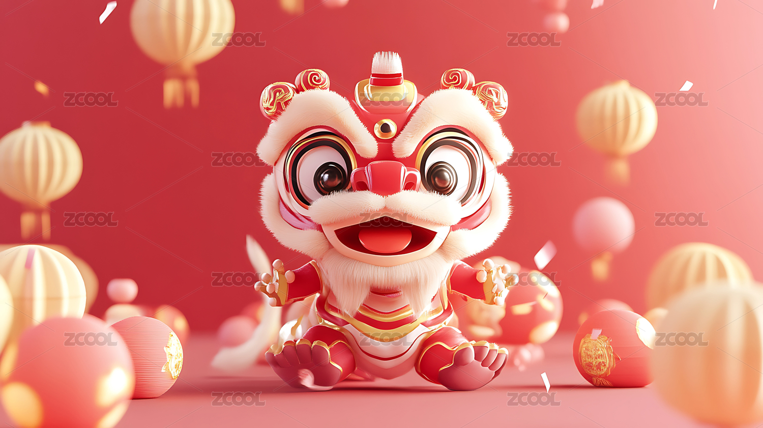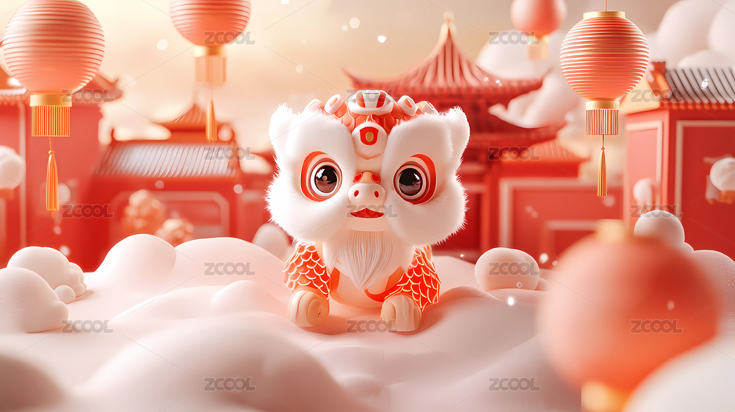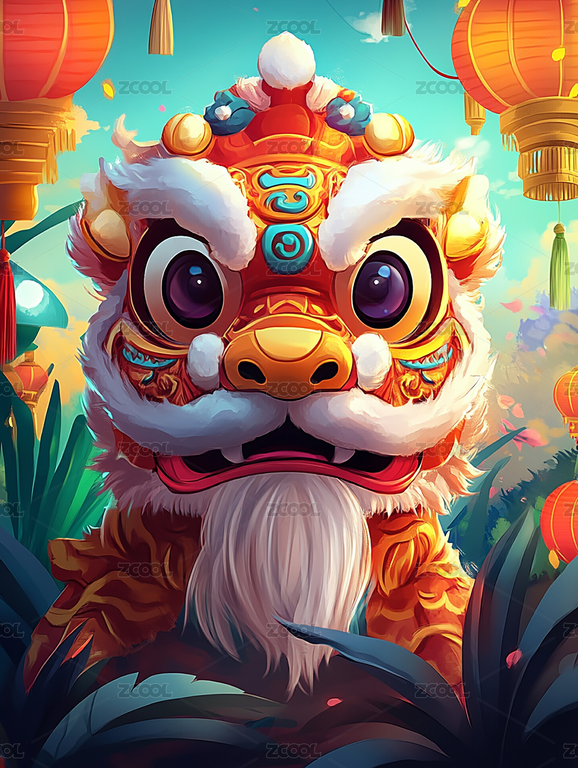 扁平化新年国潮风格醒狮喜庆氛围插画