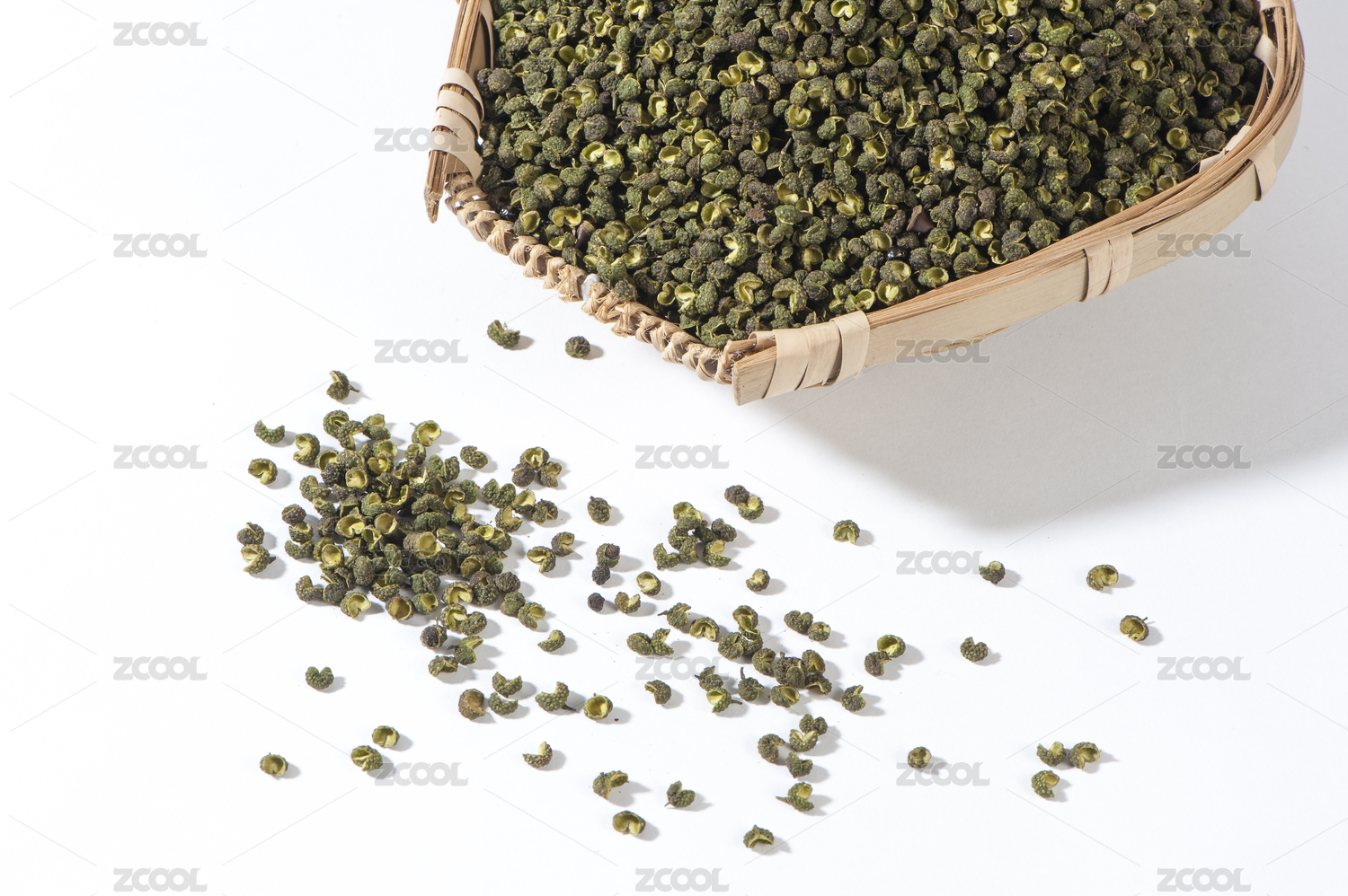 装在筲箕里面的大量的干花椒,下面是白色背景和少量散落的花椒